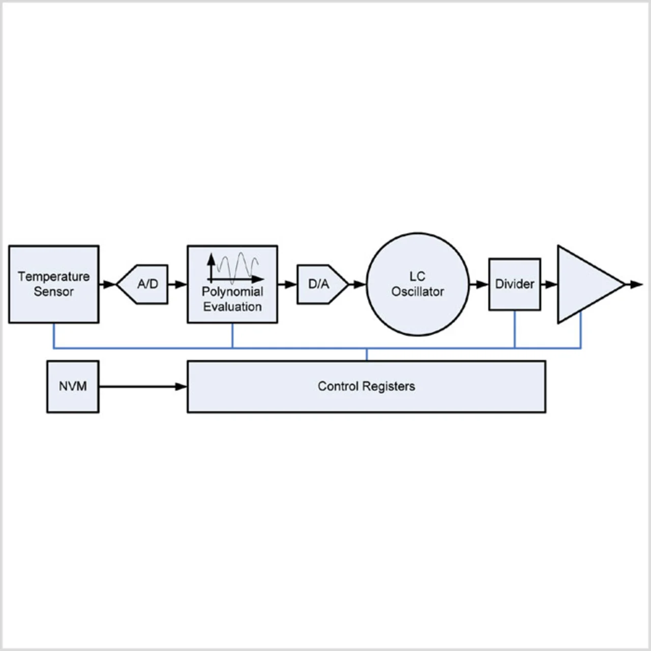 Bild 3 zeigt das Blockdiagramm des Si500. Kernelement ist ein frequenzflexibler LC-Oszillator mit niedrigem Phasenrauschen. Über »intelligente« Mixed-Signal- Analogschaltkreise ist der Oszillator gegen Frequenzabweichungen aufgrund von Betriebstemperatur, Alterung und anfänglicher Frequenzungenauigkeit sowie aufgrund sich ändernder Versorgungsspannung und Ausgangslast kompensiert. Darauf wird im Folgenden näher eingegangen. Die Wahl der Frequenz, Art des Ausgangs, Versorgungsspannung und »Output Enable« (OE) wird im nichtflüchtigen Speicher (NVM) abgelegt. Beim Systemstart kalibriert sich der Si500 selbst und konfiguriert sich mithilfe der abgelegten Parameter für den Betrieb.