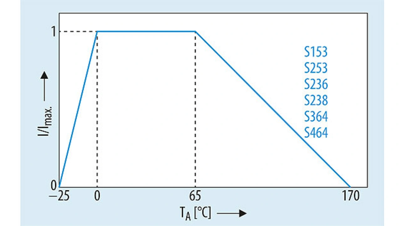Das zweite Kriterium ist der maximale Stromfluss, der durch die Leistung der Last bestimmt ist. Wichtig ist hierbei auch das »Derating« des NTC-Thermistors. Ein typisches Beispiel hierfür zeigt Bild 4. Die Derating-Kurve beschreibt die maximal zulässige Verlustleistung des Thermistors in Abhängigkeit von der Umgebungstemperatur. TDK Epcos bietet ein breites Spektrum an NTC-Thermistoren mit Anfangswiderständen von 0,5 Ω bis 33 Ω und zulässigen Strömen von 1,3 A bis 30 A.