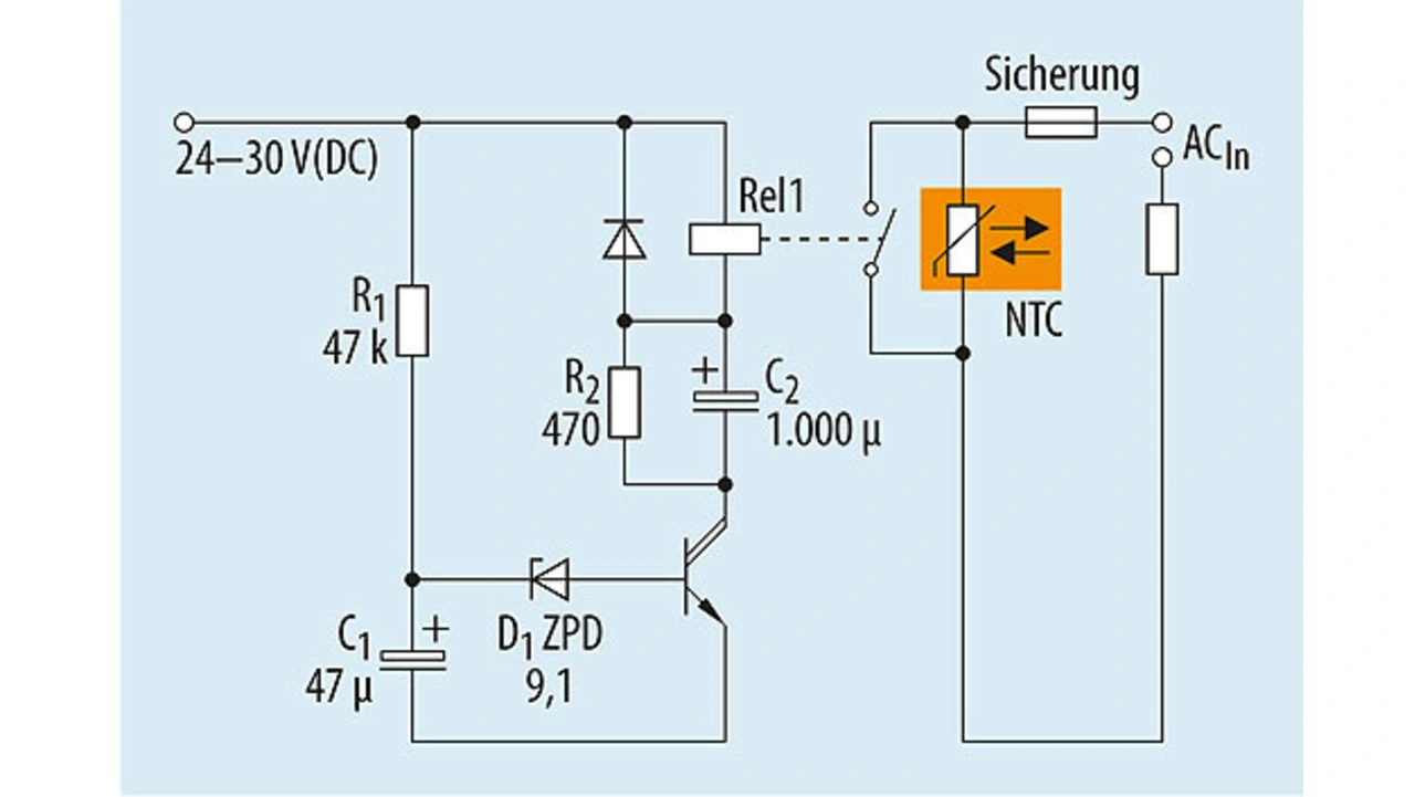 Die Ansprechzeit der Überbrückungsschaltung wird durch die Zeitkonstante aus R1 und C1 sowie den Wert der Zenerdiode bestimmt. In der Beispielschaltung spricht das Relais nach etwa 3 bis 4 Sekunden an – abhängig von den Toleranzen der Bauelemente. Beim verwendeten Relais (24 V DC, 8 A AC) liegt die Haltespannung der Spule bei rund 0,5 Un. Durch den Ladestrom von C2 spricht das Relais an und wird nach Aufladung von C2 mit der halben Nennspannung betrieben, was den Strombedarf halbiert. Besonders bei großen Nennströmen der Last ist der Leistungsbedarf dieser Schaltung geringer als die Verluste, die sich durch den ständigen Stromfluss durch den NTC-Thermistor ergeben.