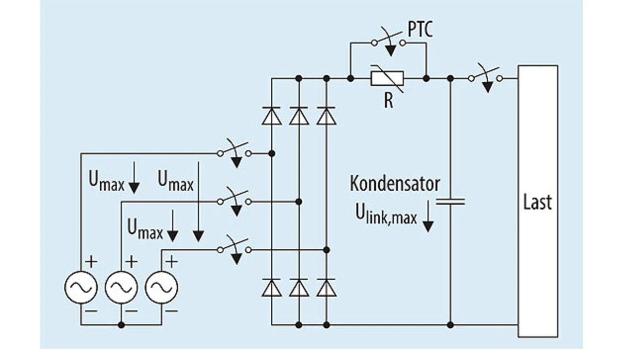 Hochkapazitive Kondensatoren und Kondensatorbänke in Gleichstrom-Zwischenkreisen stellen im Einschaltmoment einen Kurzschluss dar. Um hier eine sichere Strombegrenzung zu erzielen, sind PTC-Thermistoren statt Festwiderständen zu verwenden. Durch einen hohen Stromfluss erwärmen sich diese Bauelemente und werden – im Gegensatz zu NTC-Thermistoren – hochohmig und sind somit eigensicher. Der Vorteil dieses Verhaltens ist, dass bei einem Kurzschluss im Zwischenkreis der Strom auf unbedenkliche Werte begrenzt wird. Festwiderstände können das nicht bewerkstelligen, da sie den Strom nicht reduzieren. Bild 6 zeigt den Gleichstrom-Zwischenkreis eines Drei-Phasen-Systems mit PTC-Thermistor, der zum Beispiel in Frequenzumrichtern zum Einsatz kommt.