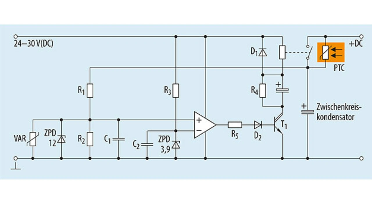 Zur Funktion der Schaltung: Der invertierende Eingang des Komparators wird über die Zener-Diode ZPD 3,9 angesteuert. Solange am nicht-invertierenden Eingang eine Spannung kleiner 3,9 V anliegt, stellt sich am Ausgang eine Spannung von nahe 0 V ein und Transistor T1 sperrt. Erst wenn über den Spannungsteiler R1/R2 an R2 eine Spannung von mehr als 3,9 V anliegt, kippt der Komparator am Ausgang auf positives Potenzial und T1 schaltet das Relais, wodurch der PTC-Thermistor überbrückt wird. Der Spannungsteiler R1/R2 sollte so bemessen sein, dass bei etwa 80 Prozent der Nenn-Zwischenkreisspannung das Relais schaltet. Da Zwischenkreisspannungen mehrere hundert Volt betragen können, müssen für R1 und R2 hochohmige Typen eingesetzt werden. Ein Beispiel: Bei einer Nennzwischenkreisspannung von 500 V DC wird der Wert von 80 Prozent bei 400 V DC erreicht. Hier liegen die Werte für R1 bei 990 kΩ und für R2 bei 10 kΩ. Der Varistor und die Zener-Diode ZPD 12 dienen zum Schutz des nichtinvertierenden Eingangs des Komparators vor Überspannungen.