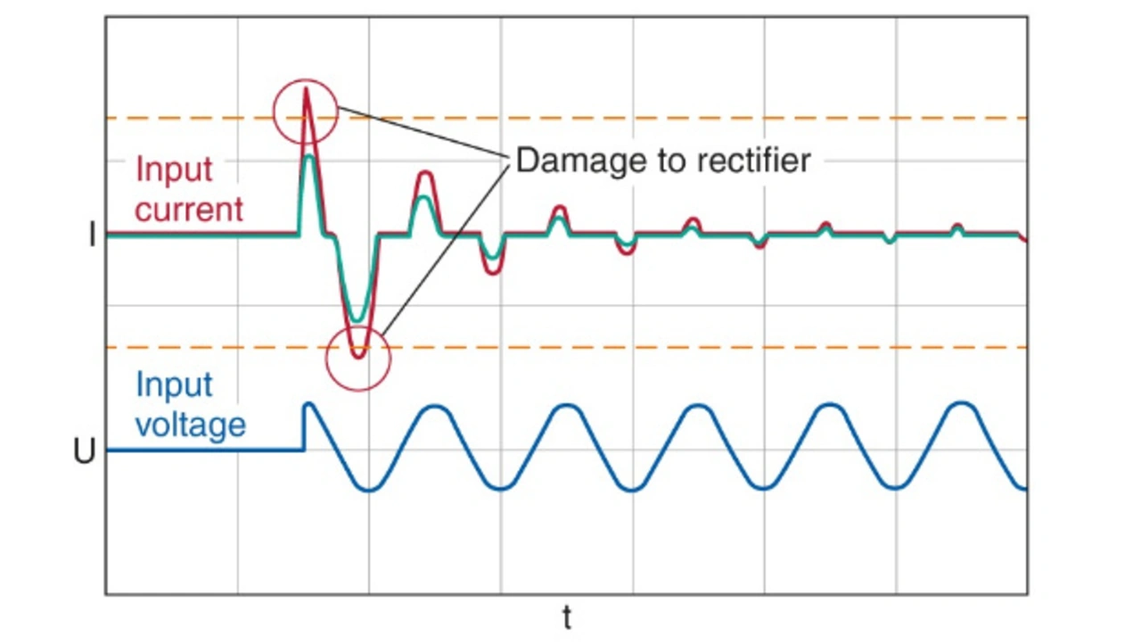 Wenn große Stromversorgungen, Frequenzumrichter oder Onboard-Charger einschalten, fließen kurzfristig Ströme, die ein Vielfaches des Nennstroms betragen können. Dabei kann es zu unerwünschten Effekten kommen wie dem Auslösen von Sicherungen oder sogar zur Schädigung des Systems. Insbesondere zwei Arten von Lasten sind für hohe Einschaltströme verantwortlich: Zum einen sind das induktive Lasten wie Antriebe und Transformatoren, die zum Aufbau der Magnetfelder sehr große Ströme benötigen. Die andere Gruppe sind hochkapazitive Kondensatoren in Gleichspannungszwischenkreisen, die im Einschaltmoment sehr hohe Ladeströme verursachen, was die Kondensatoren selbst sowie auch den Eingangsgleichrichter erheblich stresst. Bild 1 zeigt den Stromverlauf ohne (rote Kurve) und mit Einschaltstrombegrenzer (grüne Linie).