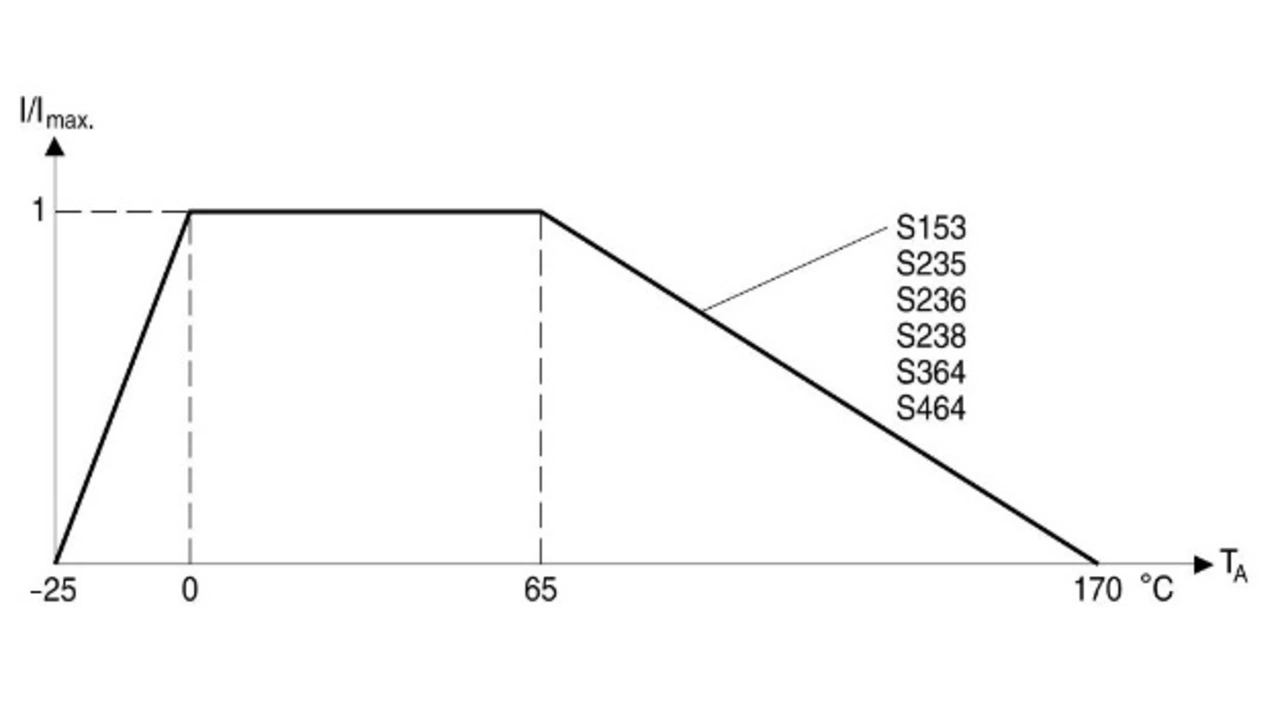 Die beiden wichtigsten Kriterien zur Bestimmung des geeigneten NTC-Thermistors sind der Anfangswiderstand R25 sowie der maximale Strom. Zuerst wird der erforderliche Anfangswiderstand bestimmt. Er muss mindestens so groß gewählt werden, dass er den Strom in die Last auf einen Wert begrenzt, der noch nicht zum Auslösen der Sicherung führt beziehungsweise Bauelemente in der Last (zum Beispiel Brückengleichrichter) nicht schädigt. Das zweite Kriterium ist der maximale Strom, der durch die Leistung der Last bestimmt ist. Wichtig ist hierbei auch das Derating des NTC-Thermistors. Ein typisches Beispiel hierfür zeigt Bild 3. TDK bietet NTCs mit Anfangswiderständen von 0,5 Ω bis 33 Ω und zulässigen Strömen von 1,3 A bis 30 A.