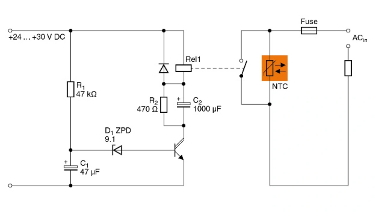 Die Ansprechzeit der Überbrückungsschaltung wird durch die Zeitkonstante aus R1 und C1 sowie den Wert der Z-Diode D1 bestimmt. In der Beispielschaltung spricht das Relais nach etwa drei bis vier Sekunden an – abhängig von den Toleranzen der Bauelemente. Beim verwendeten Relais (24 V (DC), 8 A (AC)) liegt die Haltespannung der Spule bei rund 0,5·UN. Durch den Ladestrom von C2 spricht das Relais an und wird nach Aufladung von C2 mit der halben Nennspannung betrieben, was den Strombedarf halbiert. Besonders bei großen Nennströmen der Last ist der Leistungsbedarf dieser Schaltung geringer als die Verluste, die sich durch den ständigen Stromfluss durch den NTC-Thermistor ergeben.