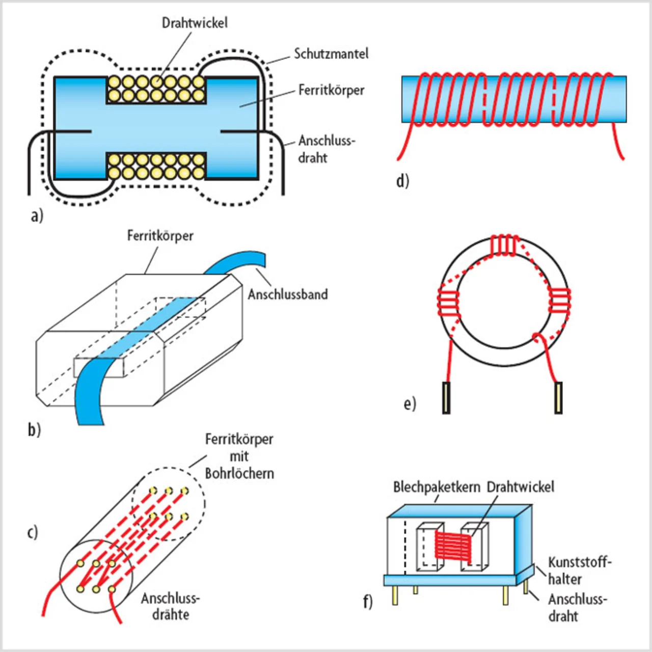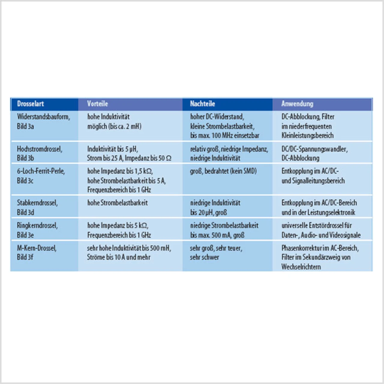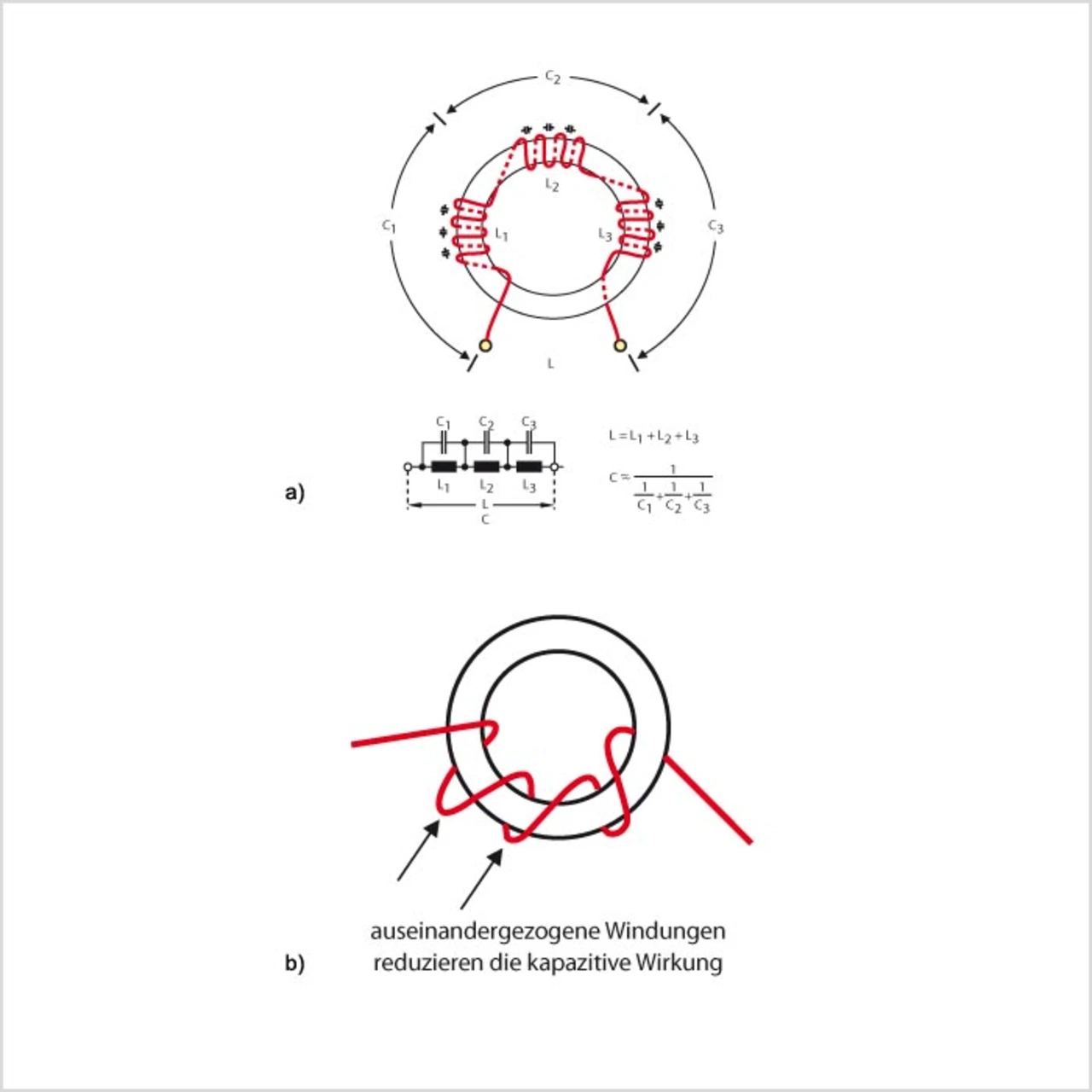 Konventionelle Entstördrosseln gibt es in unterschiedlichen Bauformen für unterschiedliche Anwendungen. Allen gemeinsam ist ein Ferrit- oder Eisenkörper mit einem Drahtwickel (Bild 3). In Tabelle 1 sind Vor- und Nachteile sowie Anwendungsfelder der Bauelemente aufgelistet. Zur Reduzierung der Koppelkapazität werden die Drahtwickel in mehrere Pakete bzw. Segmente unterteilt (Bilder 3d und 3e). Bild 4a verdeutlicht das Prinzip am Beispiel der Ringkerndrossel. Ein Auseinanderziehen der Windungen reduziert ebenfalls die kapazitive Kopplung, hier aber zwischen den einzelnen Windungen (Bild 4b). Mit steigender Windungszahl der Wickelpakete verschiebt sich übrigens die Resonanzfrequenz wegen der zunehmenden Koppelkapazität zu niedrigerer Frequenz.