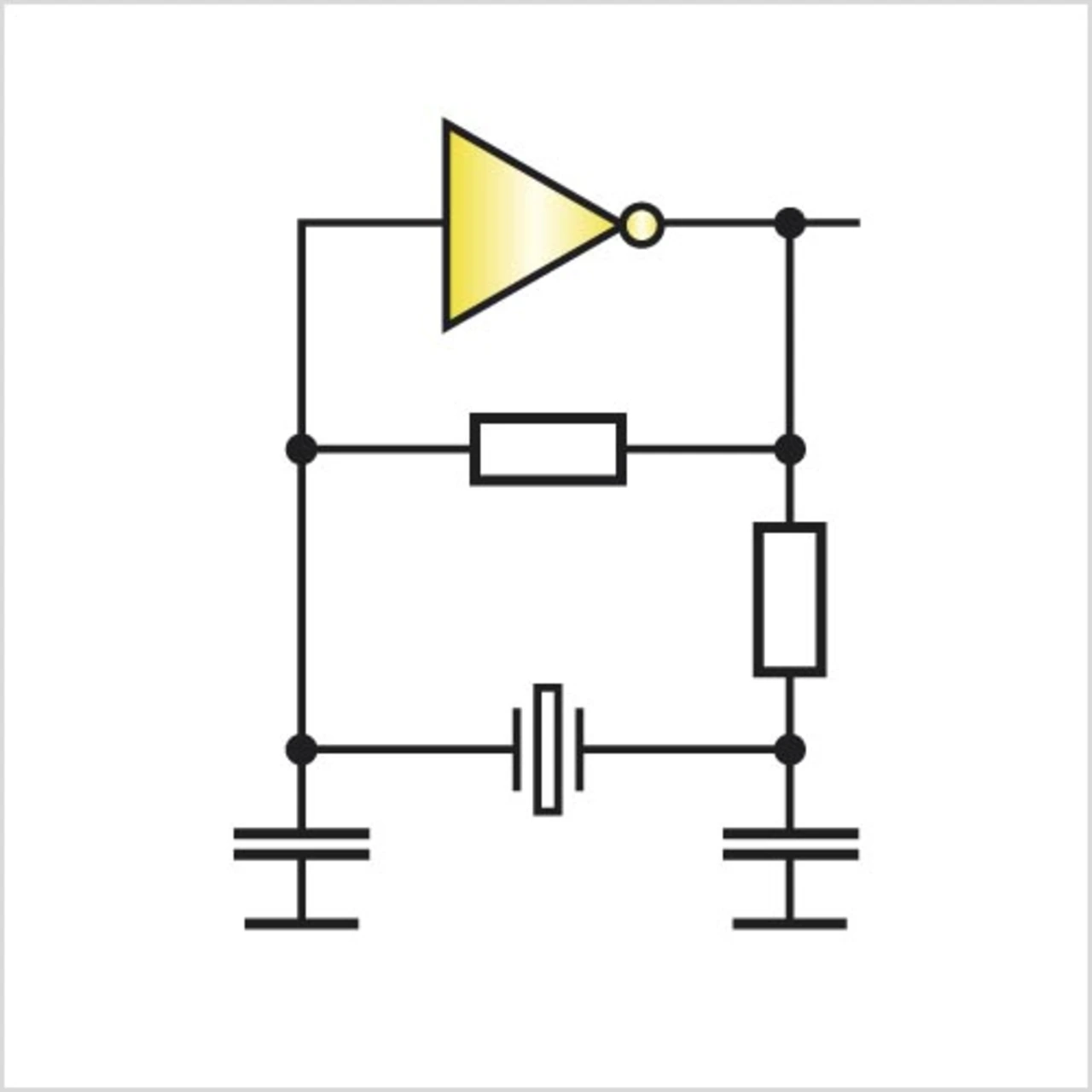 Ein Quarz-Oszillator lässt sich aufbauen, indem man einen diskreten Quarz – der die gewünschte Resonanzfrequenz aufweist – in die Rückkopplungsschleife einer Verstärkerschaltung implementiert. Ein Beispiel dafür ist die Pierce-Oszillator-Schaltung, die in Bild 2 gezeigt ist. Der Quarz ist im Allgemeinen gegenüber der Verstärkerauswahl unempfindlich, doch muss bei der Entwicklung eines Quarz-Oszillators darauf geachtet und sichergestellt werden, dass der Quarz nicht übersteuert wird. Das kann zu Ungenauigkeiten führen und in Extremfällen den Quarz selbst beschädigen. Viele Komponenten, die eine Taktquelle benötigen, beispielsweise ein Mikrocontroller (MCU) oder ein FPGA, implementieren unverzichtbare Rückkopplungsschaltungen auf dem Chip, um dadurch Platz zu sparen. Entwickler können die Oszillator-Schaltung rasch vervollständigen, indem sie den geeigneten Quarz extern bestücken – üblicherweise begleitet von einer kleinen Zahl zusätzlicher passiver Bauelemente.