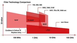 Nimmt man 5G-Sub-6 und WiFi 7 als aktuelle Beispiele, so hat das verwendete 6-GHz-Frequenzband die Obergrenze von SAW überschritten und der kritische Punkt von BAW ist erreicht (Bild 3). Wenn 5G in Zukunft die 24-GHz-Millimeterwelle nutzt, können nur noch LTCC-Filter verwendet werden, sodass die Nachfrage nach LTCC-Filtern voraussichtlich weiter steigen wird.