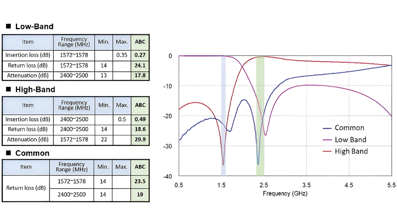 Nachdem das Mobiltelefon die Signale über die Antenne empfangen hat, müssen die jeweils relevanten Frequenzen herausgefiltert werden. Dies geschieht in der Regel in zwei Schritten: Zuerst mit einem Diplexer, der zunächst die Signale im High- und Low-Band glättet, und danach mit einem Bandpassfilter für das GPS-Signal 1,575 GHz (Bild 6).