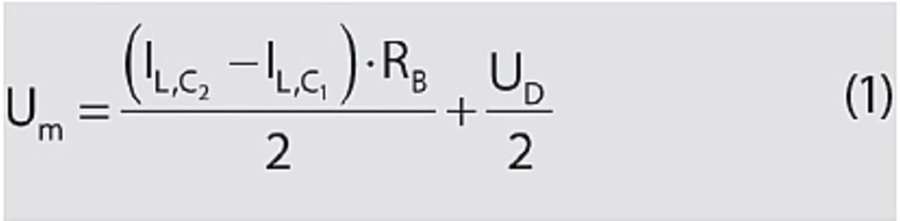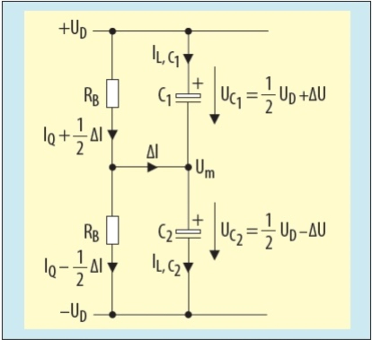 Diese Gleichung zeigt, dass die Mittelpunktspannung Um vom gewünschten Idealwert UD/2 um einen Wert abweicht, der proportional zum Widerstandswert und der Leckstromdifferenz verläuft.