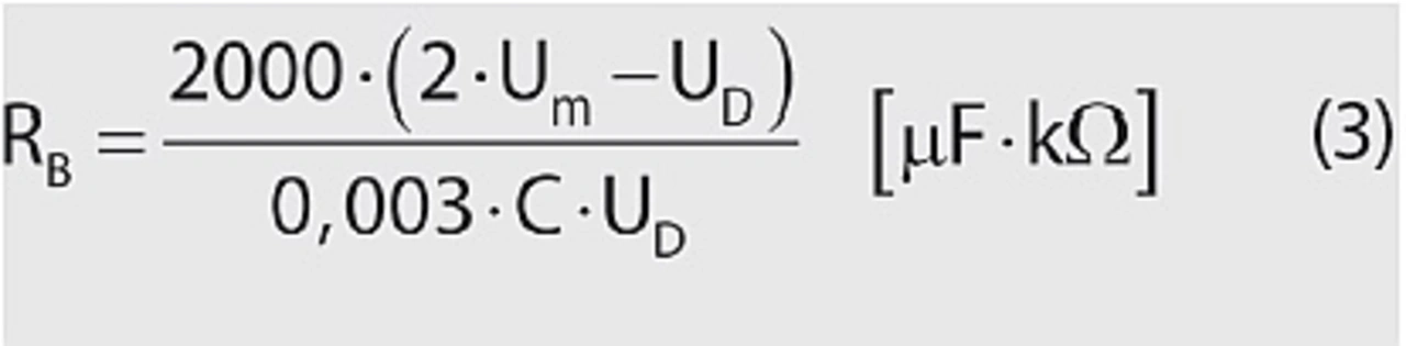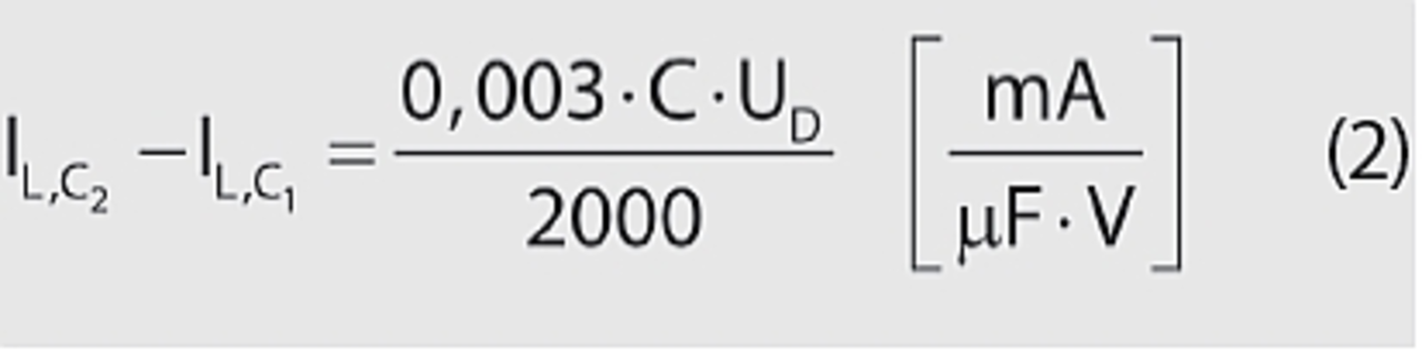 Zur Dimensionierung der Symmetrierwiderstände RB gilt es, einen guten Kompromiss zwischen geringer Verlustleistung und noch akzeptabler Spannungsdifferenz zu finden. Als Schätzwert für die Leckstromdifferenz der Elkos bei oberer Kategorietemperatur gilt laut [8] ein Wert, der sich mit Gleichung 2 ermitteln lässt: