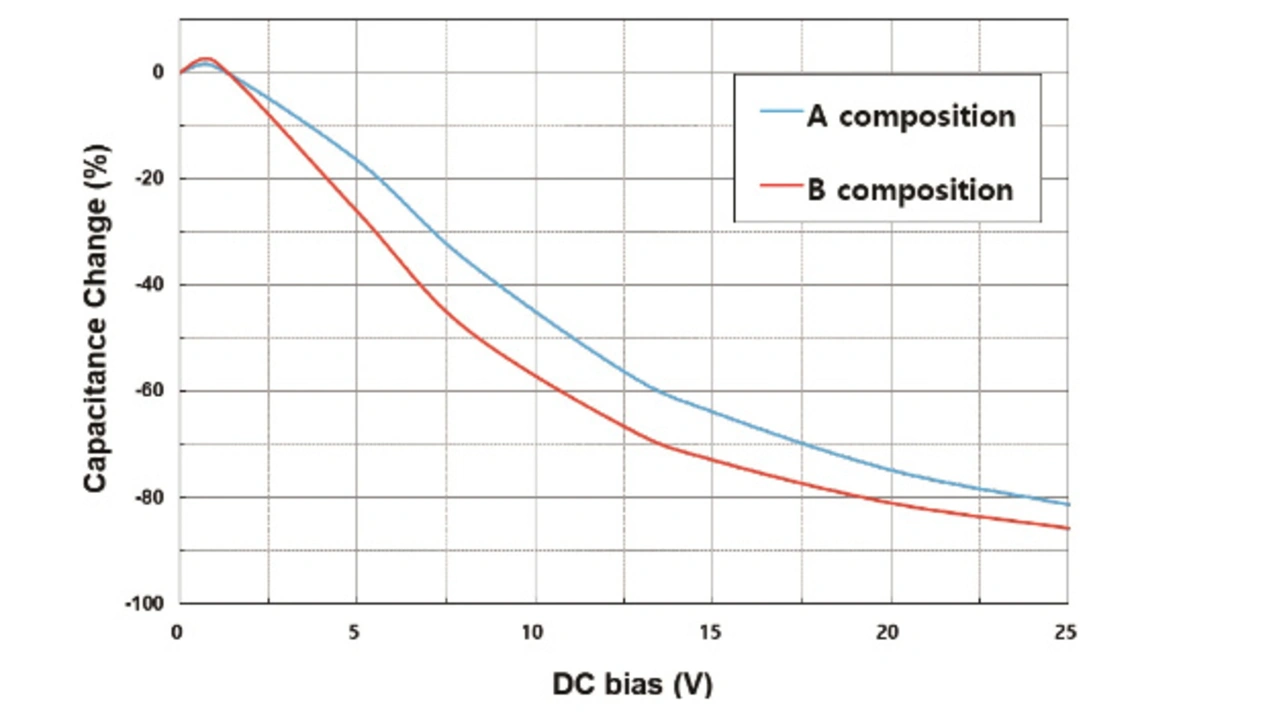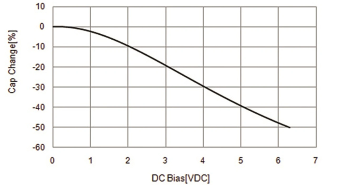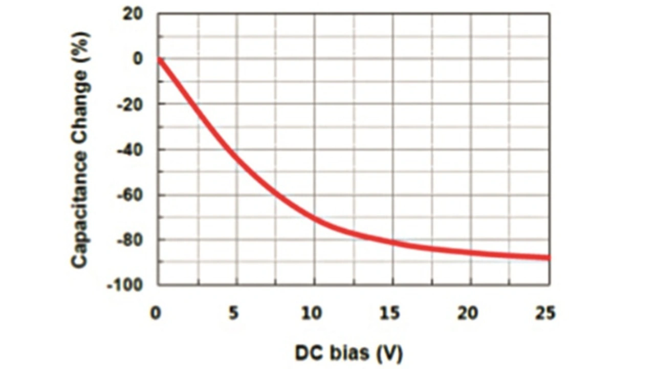 Am besten lässt sich der DC-Bias-Effekt im Labor demonstrieren. Der Hersteller TDK verband für die Tests einen 1-µF-Kondensator (Nennspannung 25 V) in der Bauform 3216 mit einer X7R-Keramik mit einem LCR-Meter. Dieses zeigte bei einer Spannung von 0 V einen Wert von 1 µF an. Legte man 25 V an, war die Kapazität gegenüber dem Nennwert um über 40 % abgefallen.