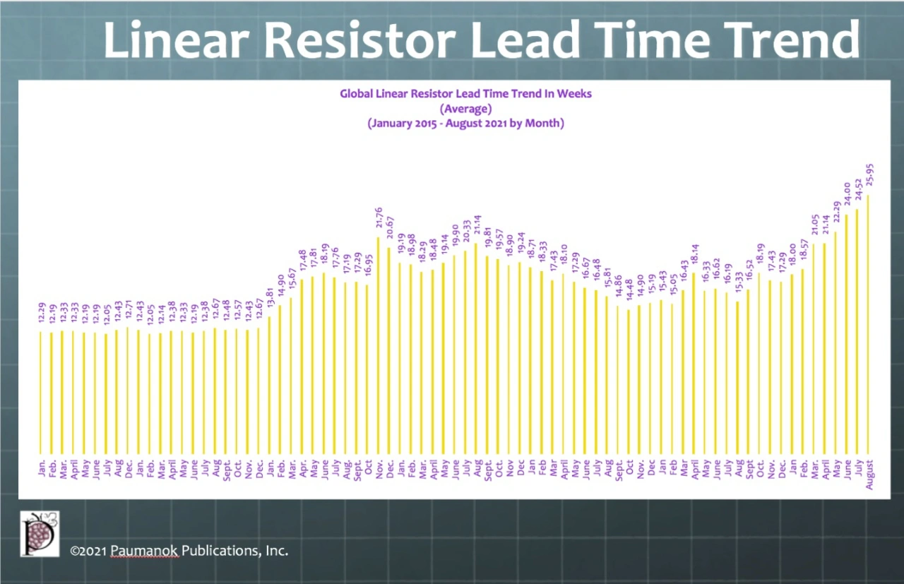 Im August 2021 stiegen die Lieferzeiten auf dem Markt für Widerstände im Vergleich zum Vormonat um 5,8 Prozent. Wie in früheren Berichten dargelegt, wird die Lieferkette für Widerstände weiterhin massiv dadurch belastet, dass die Preise für Rohstoffe wie Ruthenium und die Verfügbarkeit von Substraten und Körpern aus Aluminiumoxid stark steigen.