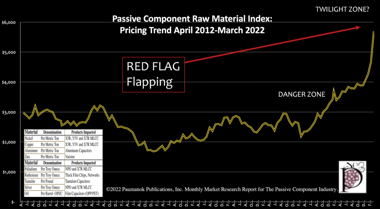 Die Preise für passive Komponenten erreichten im Dezember 2021 ihren Höchststand und gingen dann bis März 2022 zurück, da sich die Lagerbestände in den Schlüsselsektoren aufbauten. Mit dem Konflikt in Europa sind die Preise für die wichtigsten Materialien jedoch plötzlich in die Höhe geschossen. Die Kosten dieses Krieges werden hoch sein, und jeder, der ein Mobiltelefon, einen Computer, ein Fernsehgerät, ein Haushaltsgerät oder ein Auto kauft, wird dafür bezahlen.