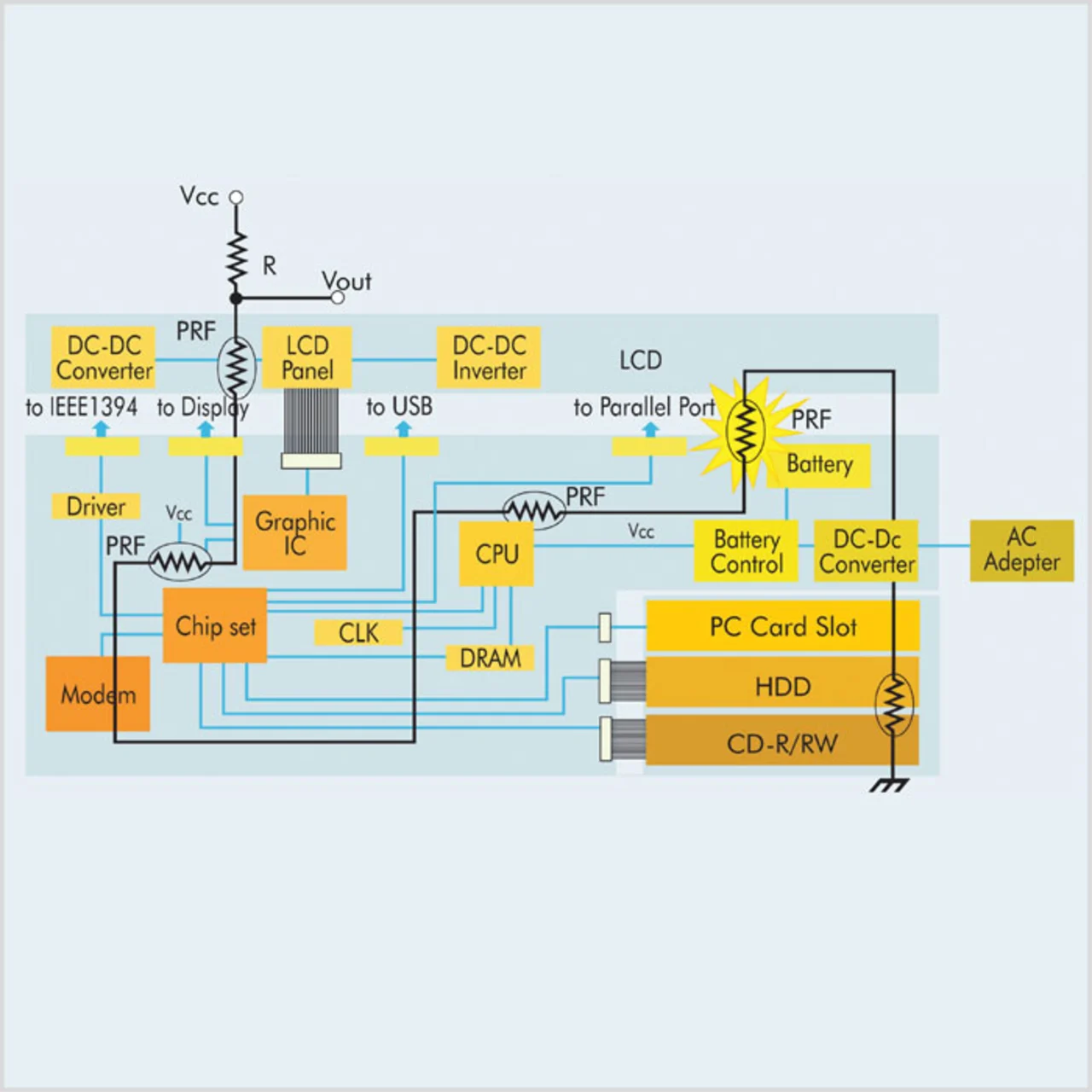 Das Anwendungsbeispiel in Bild 3 zeigt das Motherboard eines Notebook-PCs. Mit fünf Thermistor-Chips lassen sich hier Überhitzungen an fünf Stellen erkennen, und zwar völlig ohne die aufwändigen Signalverarbeitungs- und Regelschaltungen, wie sie bei den üblichen Temperaturerfassungsschaltungen auf der Basis von NTC-Widerständen erforderlich wären. Die NTC-Version würde außerdem zusätzliche Sensoren und Sensorschaltungen erforderlich machen, wenn weitere Punkte auf der Leiterplatte überwacht werden sollen. Nicht zuletzt gestaltet sich die Verifikation der Schaltung hierdurch problematischer.