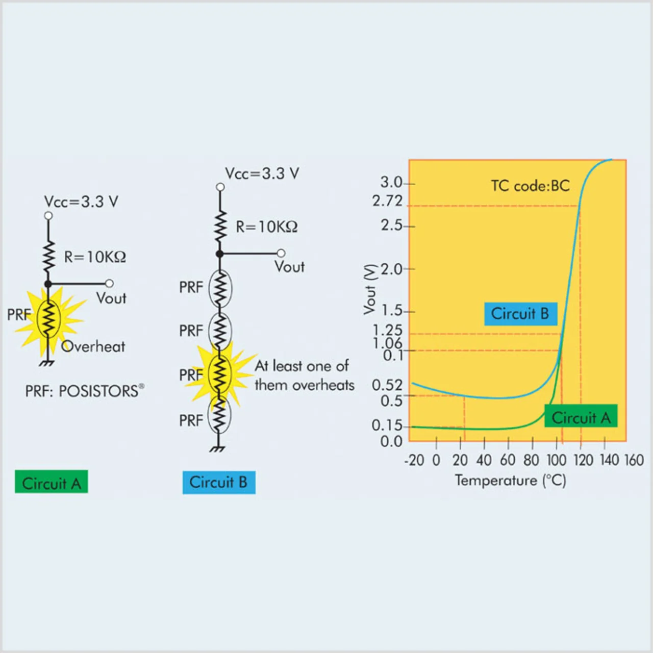 Schaltung A in Bild 2 ist eine Überhitzungserkennungs-Schaltung auf der Basis eines PTC-Chipwiderstands. Kommt hierfür beispielsweise ein Baustein des Typs »PRF18BC471Qx« zum Einsatz, wird ein Spannungsteilerwiderstand von 10 kΩ benutzt, und beträgt die Betriebsspannung Vcc 3,3 V, so stellt sich die rechts in Bild 2 wiedergegebene Beziehung zwischen der Temperatur am PTC und der Ausgangsspannung (Vout) der Schaltung ein. Die bei Zimmertemperatur 0,15 V betragende Ausgangsspannung steigt auf 1,06 V an, wenn die Temperatur +105 °C erreicht.
