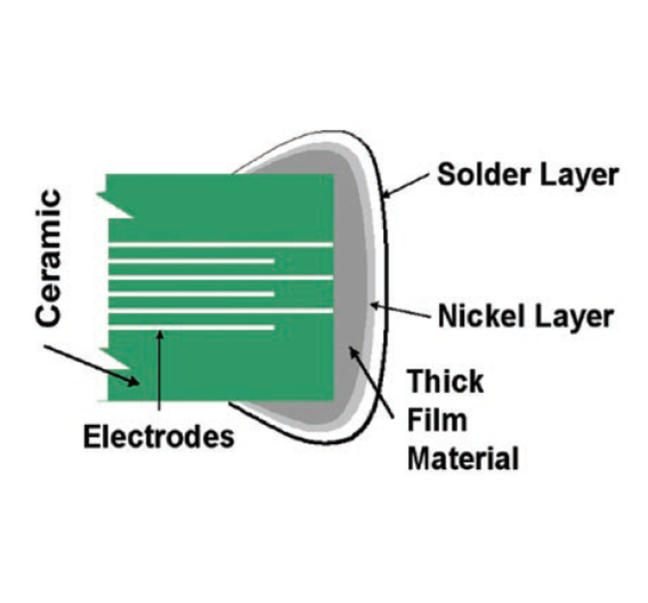 Ein plattiertes Anschlusssystem, wie es bei Kondensatoren, Widerständen und anderen Elektronikbauteilen üblich ist, ermöglicht eine wesentlich bessere Lötverbindung (Bild 5). Auch bei einem plattierten Anschlusssystem wird das Anschluss-Grundmaterial noch genutzt (es stellt den Kontakt zwischen den Elektroden und der Schaltung her). Auf dem Grundmaterial befindet sich eine Nickelschicht, mit der sich das Lot beim Löten verbindet. Diese Schicht muss so dick sein, dass sie beim Infrarot- oder Wellenlöten intakt bleibt und das Dickschichtmaterial nicht abgetragen wird. Sie muss außerdem so dick sein, dass die intermetallische Schicht zwischen dem Dickschichtanschluss und der Nickelschicht die Lötbarkeit nicht beeinträchtigt.