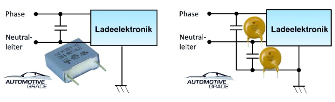 Diese Batterien werden mithilfe einer Steckdose oder einer Ladesäule aufgeladen. Dadurch benötigt man im Fahrzeug eine Ladeelektronik, auch OBC (On Board Charger) genannt, mit entsprechender AC/DC-Umwandlung. In dieser Hinsicht kann man derartige Ladegeräte in Fahrzeugen mit Mobiltelefonen und deren Netzteilen vergleichen, jedoch mit höherem Leistungsniveau und mit wesentlich höherer Energiedichte. Jedoch unterscheiden sich die Anforderungen an Sicherheitskondensatoren im Automobilbereich zum Teil von denen in traditionellen Anwendungen. Aus diesem Grund müssen im Automobilbereich für die OBC-Anwendung spezielle, Automotive-qualifizierte Sicherheitskondensatoren zum Einsatz kommen.