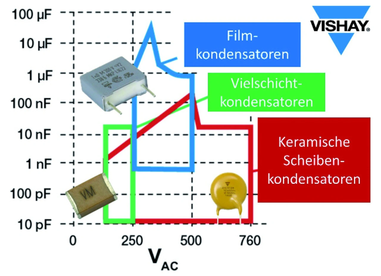 Als Klasse-X- oder Klasse-Y-Kondensator eignen sich auch Vielschichtkondensatoren, allerdings erfüllen nur Klasse-X1- oder Klasse-Y2-Bauteile die Anforderungen für Automotive-qualifizierte Sicherheitskondensatoren. Welcher Kondensatortyp für die Ladeelektronik eines HEV oder EV infrage kommt, hängt von der Verschaltung ab, den zu erwartenden Spannungsimpulsen und davon, welche Wechselspannungen an dem jeweiligen Sicherheitskondensator anliegen. Das Einsatzgebiet der verschiedenen Sicherheitskondensatorlösungen in Abhängigkeit von der erreichbaren Kapazität und Wechselspannungsfestigkeit zeigt Bild 2. Vishay Intertechnology deckt den kompletten Kapazitätsbereich ab mit Filmkondensatoren, keramischen Scheibenkondensatoren und Vielschichtkondensatoren. Dazu kommen Automotive-qualifizierte Film- und Keramikkondensatoren, welche die Automobilanforderungen sogar übertreffen. Wie das funktioniert, folgt hier.