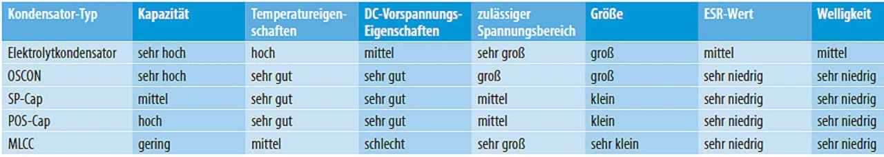 Im Allgemeinen stehen für den Ein- und Ausgang eines Gleichspannungswandlers verschiedene Kondensatortypen zur Auswahl. Die Tabelle listet in diesem Zusammenhang verschiedene Kondensatortypen aus dem Hause Panasonic auf; zu nennen sind Elektrolytkondensator, OSCON, SP-Cap, POS-Cap, Folienkondensator und Keramikvielschicht-Chipkondensator (Multi Layer Ceramic Capacitor, MLCC), deren Vor- und Nachteile anhand wichtiger Leistungsmerkmale dargestellt werden. Denn die Frage, welcher Kondensatortyp – MLCC, Aluminium-Elektrolyt, Polymer oder Tantal – für eine bestimmte Konstruktion am besten geeignet ist, hängt in der Regel von der Anwendung ab.