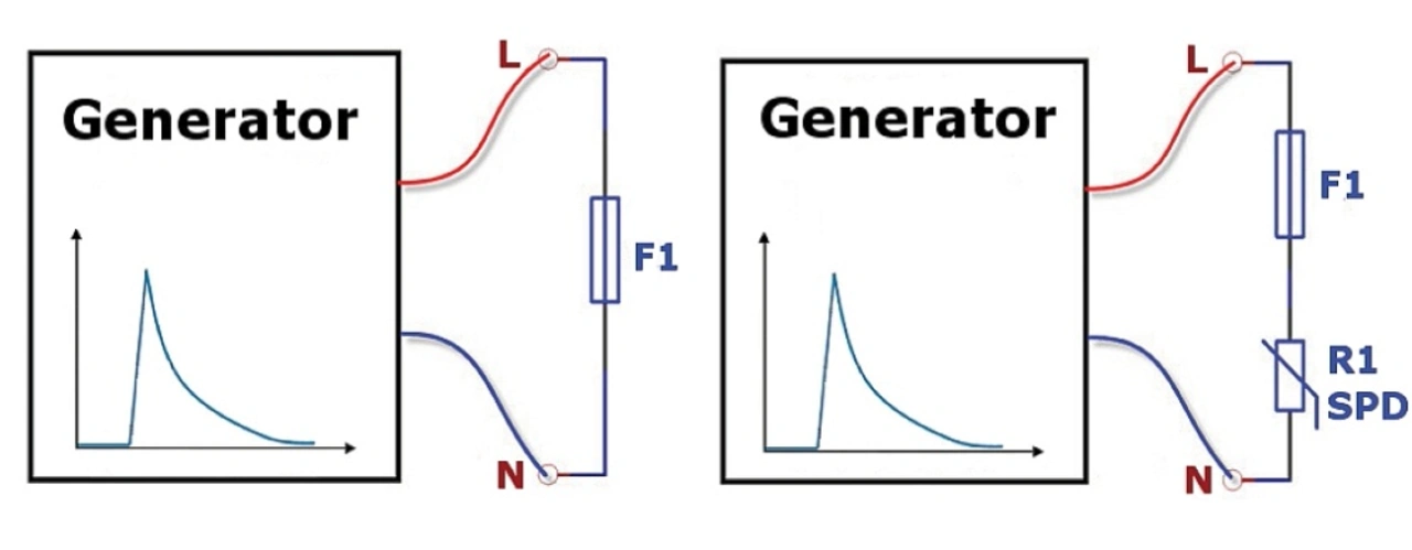 Setup S1 ist ein Stromstoß 8/20μs direkt auf Sicherung F1. Dieser Test erreicht die höchste Belastung für die Sicherung durch den Überspannungstest. Variante S2 ist ein realistisches Setup für einige Anwendungen mit einem SPD in Serie. Der Kombinationswellen-Überspannungsgenerator erzeugt ein Mischsignal von 1.2/50-μs-Spannungs- und 8/20μs-Stromimpuls.