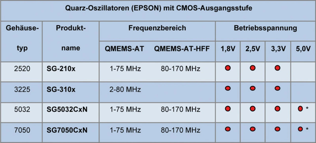 Die Tabelle gibt einen Überblick über aktuelle Oszillatoren des Herstellers Epson mit direkter Frequenzerzeugung und unsymmetrischer CMOS-Ausgangsstufe. Diese Produkte unterstützen die SMD-Standard-Gehäuse von 2520 bis 7050 und die Betriebsspannungen 1,8, 2,5 und 3,3 V. Für die Bauformen SG5032 und SG7050 kann auch eine Versorgung mit 5,5 V gewählt werden, allerdings ist diese Option nur für einen eingeschränkten Frequenzbereich (2,5 bis 50 MHz) lieferbar. Die Kombination des Temperaturbereichs von -40 bis +85 °C mit der Frequenztoleranz von +/-50 ppm steht in jeder Serie zur Verfügung, die Kombination des Temperaturbereichs von -40 bis +105 °C mit der Frequenztoleranz +/-100 ppm in den Serien SG-210x, SG5032 und SG7050. Bei einigen Produkten können noch andere Temperaturbereiche und Toleranzen gewählt werden. Mit Werten von 2,4 mA (SG-210STF bei 20 MHz und 1,8 V) bis 11,0 mA (SG7050CBN bei 170 MHz und 3,3 V) ist die Stromaufnahme dieser Oszillatoren sehr gering. Ebenfalls sehr klein sind die Jitter-Werte, für den SG-210S*H (80 bis 170 MHz) werden 0,7 ps max. angegeben (Offsetfrequenz: 12 kHz bis 20 MHz).