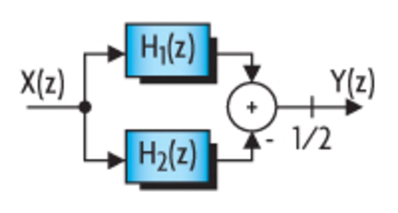 Brücken-Wellendigitalfilter setzen sich aus zwei Brückenzweigen zusammen, wie das Blockdiagramm in Bild 6 zeigt. Die beiden Brückenzweige lassen sich durch die Kaskadierung einfacher Allpässe zweiter und gegebenenfalls einem erster Ordnung realisieren. Die Übertragungsfunktion eines Brücken- Wellendigitalfilters kann mit Hilfe der Übertragungsfunktionen H1(z) und H2(z) der beiden Allpasszweige wie folgt beschrieben werden [5, 6]: