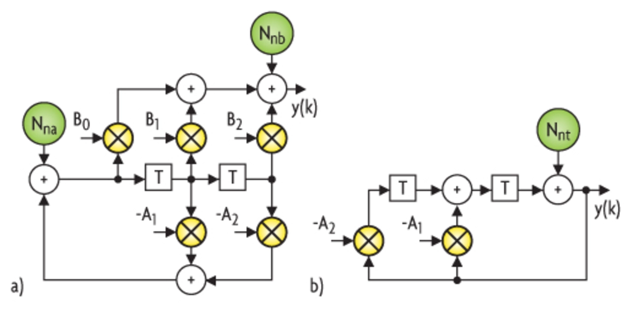 Hierbei entspricht Q der Quantisierungseinheit oder dem LSB (Least Significant Bit). In einem Block zweiter Ordnung finden bis zu fünf Multiplikationen statt. Geht man davon aus, dass hinter jedem Multiplizierer eine Wortlängenbegrenzung stattfindet, so kann man an der entsprechenden Stelle im Ersatzschaltbild eine Rauschquelle Nn einfügen. zeigt die entsprechende Ersatzschaltung für die Struktur in Bild 2a, wobei die Rauschquellen hinter den Multiplizierern mit den Koeffizienten Ai zur Rauschquelle Nna und die der Bi zur Rauschquelle Nnb zusammengefasst wurden. Es gilt: