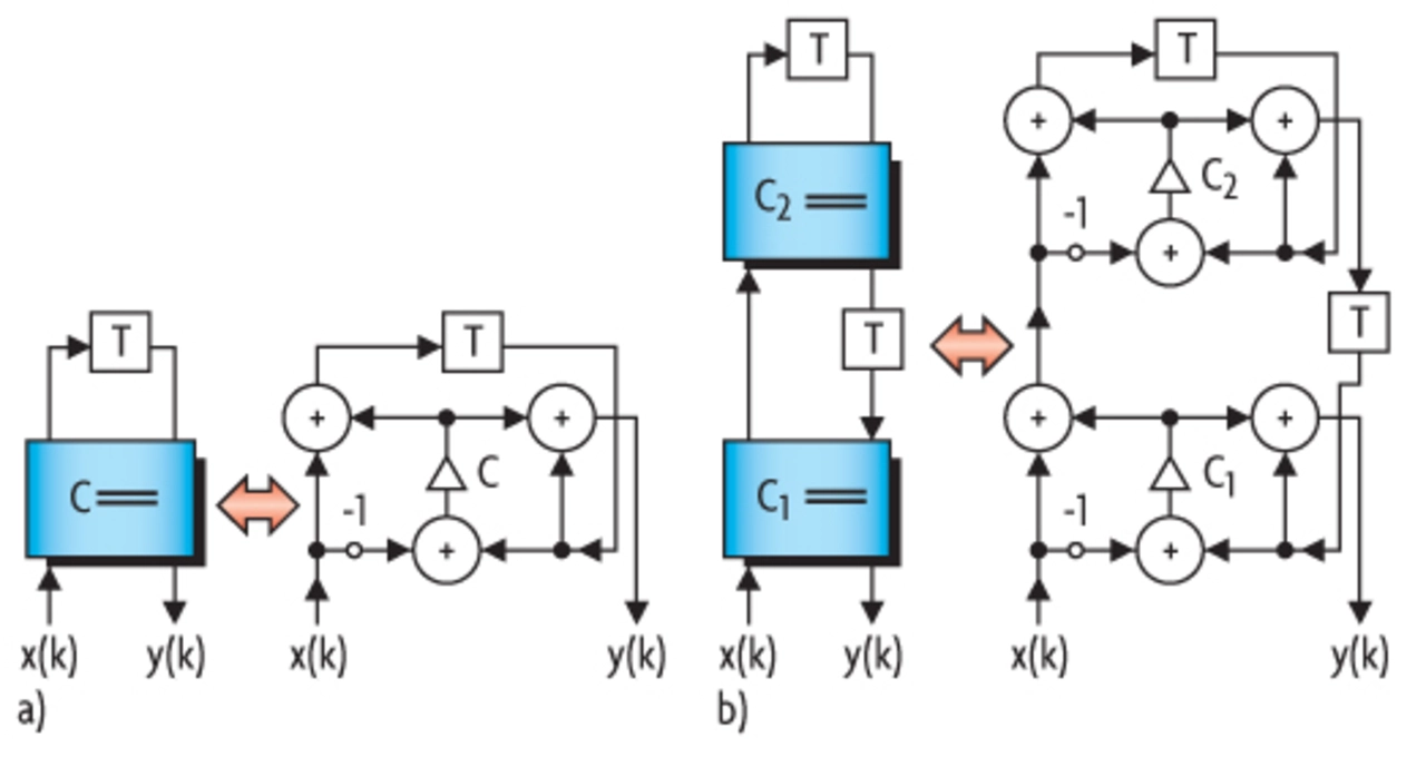 Wellendigitalfilter [5, 6] haben eine Reihe von Vorteilen gegenüber den bisher betrachteten, rekursiven Filterstrukturen. Insbesondere weisen sie hervorragende Stabilitätseigenschaften auf. Dies gilt selbst unter nichtlinearen Betriebsbedingungen, zum Bei spiel hervorgerufen durch Runden oder Überläufe. Darüber hinaus ist der Dynamikbereich bei vorgegebener Wortlänge deutlich besser als bei den zuvor vorgestellten Strukturen. Dies ist insbesondere darauf zurückzuführen, dass sich Wellendigitalfilter bei geeignetem Entwurf so verhalten wie das passive Referenzfilter, von dem sie abgeleitet wurden.