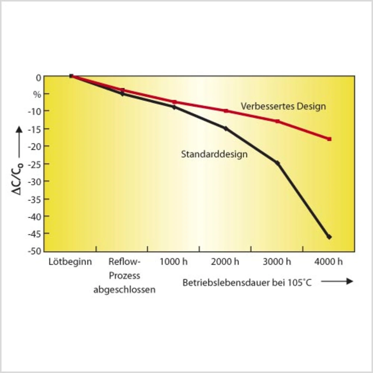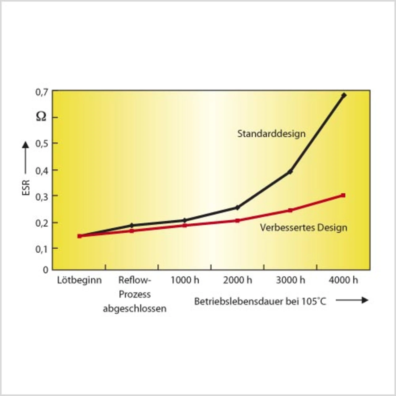 Dieser kombinierte Ansatz wird empfohlen, um die Zuverlässigkeit und Leistungsfähigkeit bleifreier Elektronikprodukte zu gewährleisten. Die Bilder 4 und 5 dokumentieren die erhöhte Langzeitstabilität, wie sie durch die beschriebenen Konstruktionsverbesserungen erzielt wurde. Die Diagramme stellen Ergebnisse aus Langzeittests von Kondensatoren dar, die nach bleifreiem Löten laut Bild 3 betrieben wurden: Der Vergleich zeigt die Kapazitätsabweichung und die ESR-Zunahme von Standardbauteilen und verbesserten Bauteilen. Verbesserte Materialien und eine verstärkte Konstruktion erhöhen somit Lebensdauer und Stabilität der Bauteile. (Alfred Goldbacher)