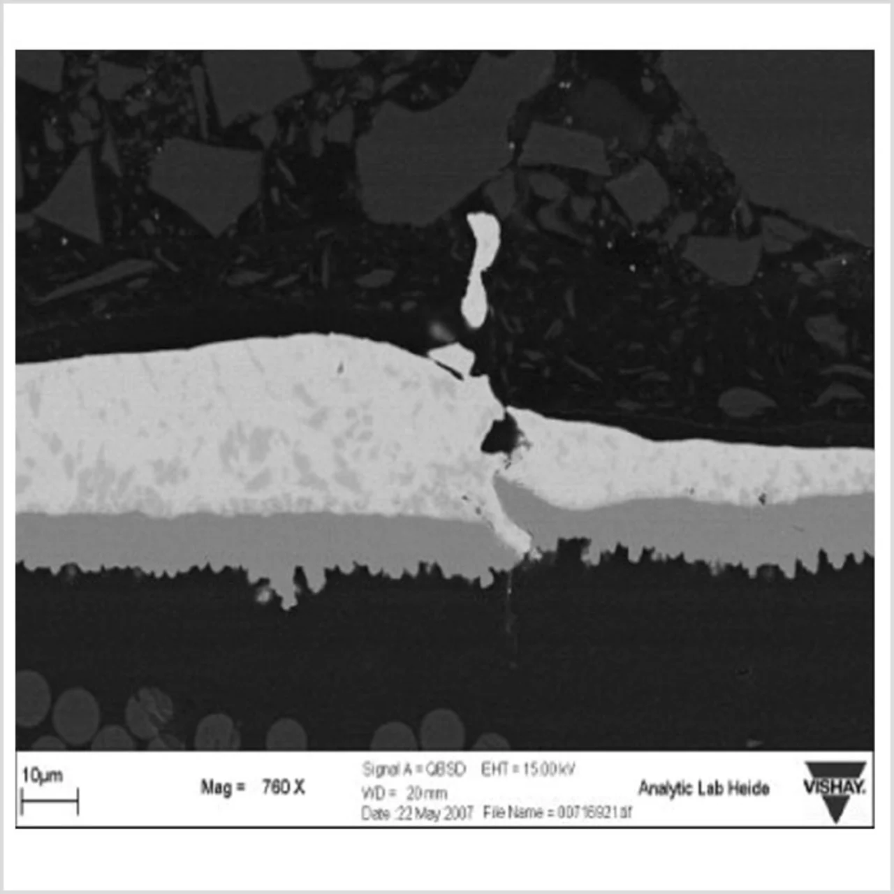 Die Stabilität der Sicherungscharakteristik hängt eng mit dem Bauteildesign zusammen. Die Reproduzierbarkeit wiederum hängt vor allem von der Prozessstabilität und Präzision der Fertigungstechnik der Chipsicherung ab. Was bedeutet eigentlich elektrische Stabilität im Rahmen einer Sicherungscharakteristik? Der ohmsche Widerstand der Chipsicherung ist der Parameter, der die Sicherungsmerkmale bestimmt. Da die zugeführte Energie unter Überlast proportional zum Widerstandswert ist, wird eine Sicherung bei zunehmendem Widerstand schneller durchschmelzen. Im Gegensatz dazu führt ein geringerer Widerstand zu einer längeren Schmelzdauer. Die Erfahrung mit Dickfilm-Widerständen hat gezeigt, dass thermische Belastungen wie kurzzeitige Überlast, Löten und Pulsbelastung den elektrischen Widerstand langsam erhöhen. Genau dieses Phänomen ändert die Charakteristik einer Chipsicherung, was kürzere Schmelzzeiten zur Folge hat. Sicherungselemente, die verschiedene Materialien enthalten, zum Beispiel Bronze für einen hohen I²t-Wert, sind nach mehrmaliger thermischer Belastung besonders empfindlich hinsichtlich schnellerer Abschaltzeiten. Die Belastungen verursachen eine Oberflächendiffusion der einzelnen Materialien. Bild 4 zeigt den fortschreitenden Diffusionsprozess von Bronze nach Pulsbelastungen.