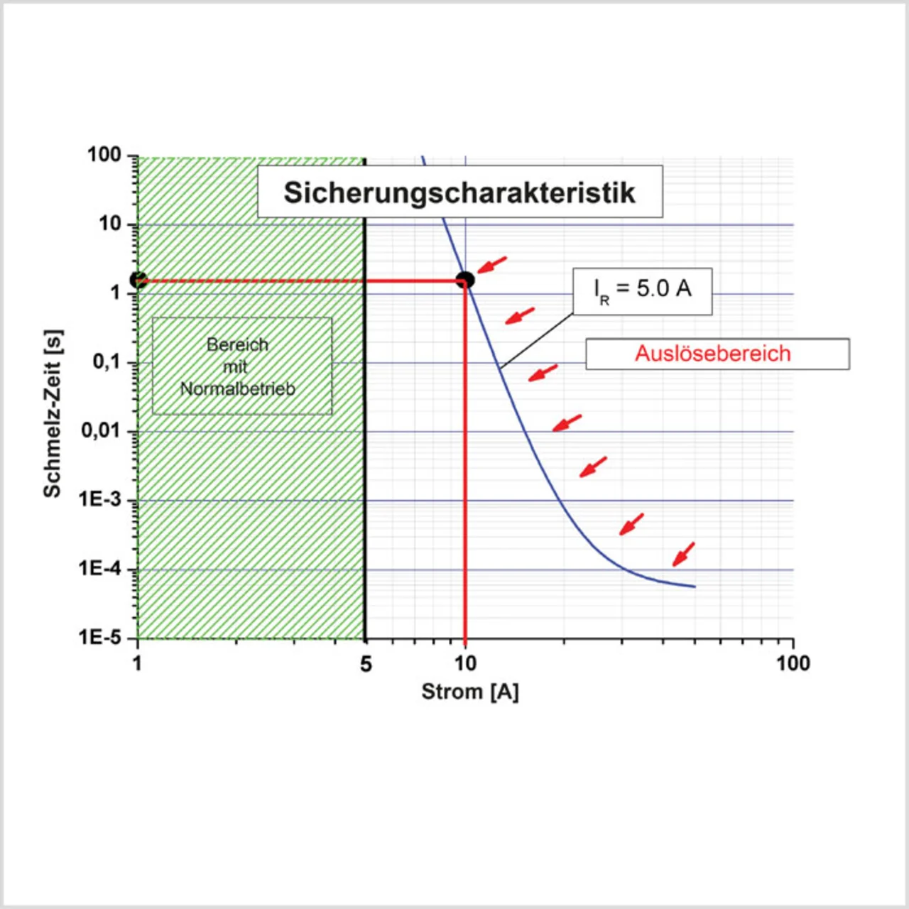 Die Sicherungscharakteristik (Bild 1) ist ein wesentliches Merkmal einer Schmelzsicherung. Der Bereich innerhalb der grün schraffierten Fläche weist den normalen »transparenten « Betrieb innerhalb des Bemessungsstroms IR aus, der für die dargestellte Sicherung 5 A beträgt. Die blaue Linie beschreibt die Schmelzzeiten bei bestimmten Überstromwerten. Oberhalb von 5 A führt die elektrische Leistung, die innerhalb des Sicherungselements entsteht, also zum Schmelzen oder Verdampfen des Elements.