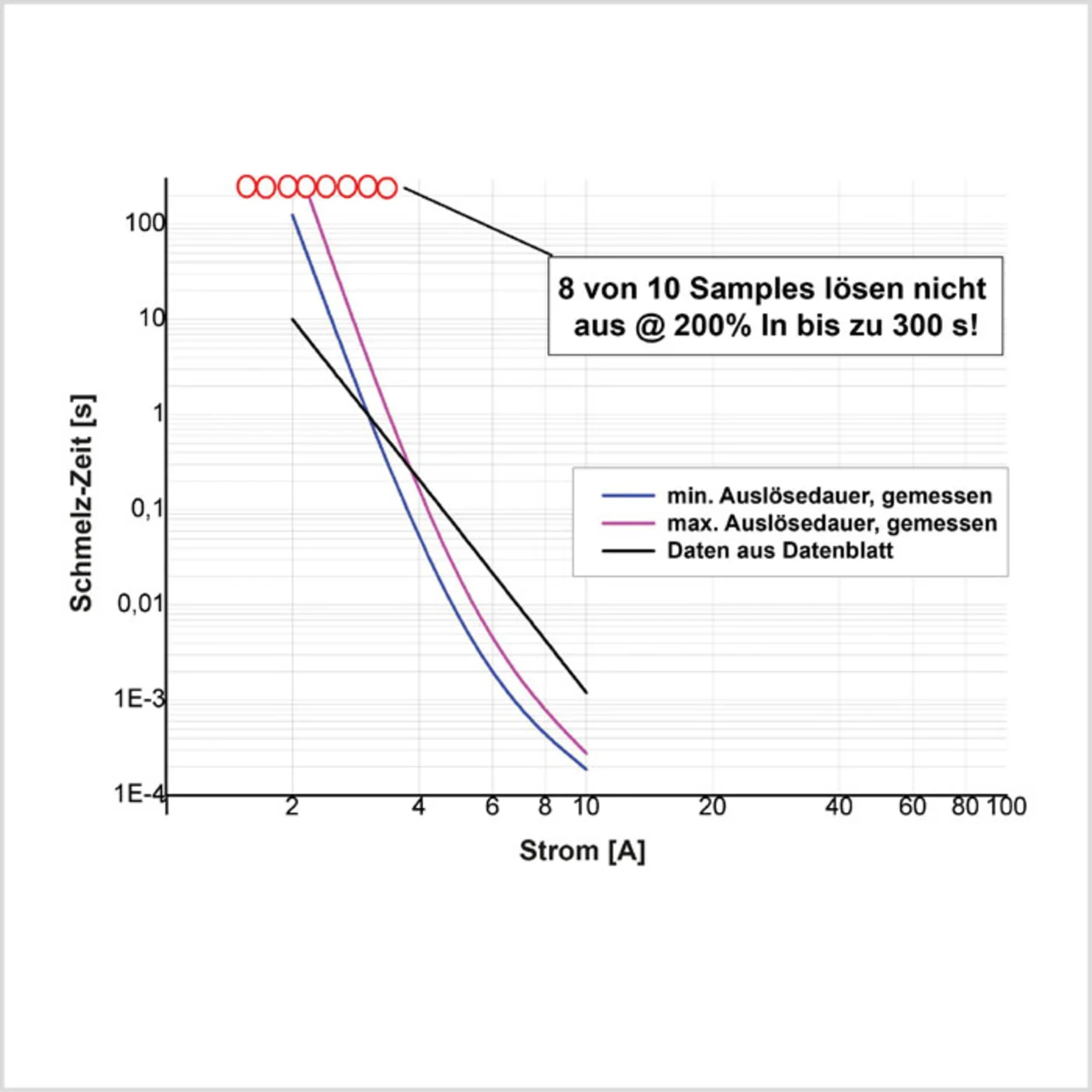 Ist der thermische Widerstand zwischen Sicherungselement und Umgebung beispielsweise zu klein, steht nicht genügend Energie bereit, um das Sicherungselement zum Schmelzen zu bringen. Die Sicherung kann nicht rechtzeitig reagieren und Überlastströme, die doppelt so groß sind wie der Bemessungsstrom, nicht sicher unter 120 s abschalten.