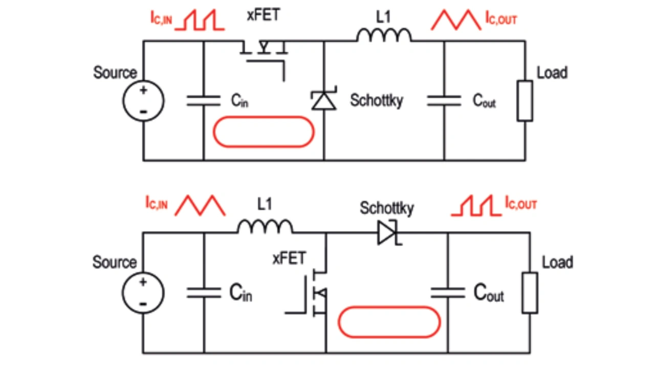 Des Weiteren ist zu beachten, dass sich die Schaltregler-Topologien dahingehend unterscheiden, ob diese Störungen bevorzugt am Eingang oder am Ausgang verursachen. Beim Hochsetzsteller (Boost Converter) ist der Ausgang kritischer, da zwischen dem schaltenden MOSFET und dem Eingang die Speicherdrossel als Bremse für den Stromanstieg (di/dt) sitzt (Bild 1 oben). Demgegenüber ist der Tiefsetzsteller (Buck Converter) am Eingang kritischer, da bei dieser Topologie die Speicherdrossel zwischen MOSFET und Ausgang platziert ist (Bild 1 unten). Somit ist leicht ersichtlich, dass ein Tiefsetzsteller vor allem ein Eingangsfilter, ein Hochsetzsteller jedoch vor allem ein Ausgangsfilter benötigt, um den diskontinuierlichen Stromfluss zu dämpfen.