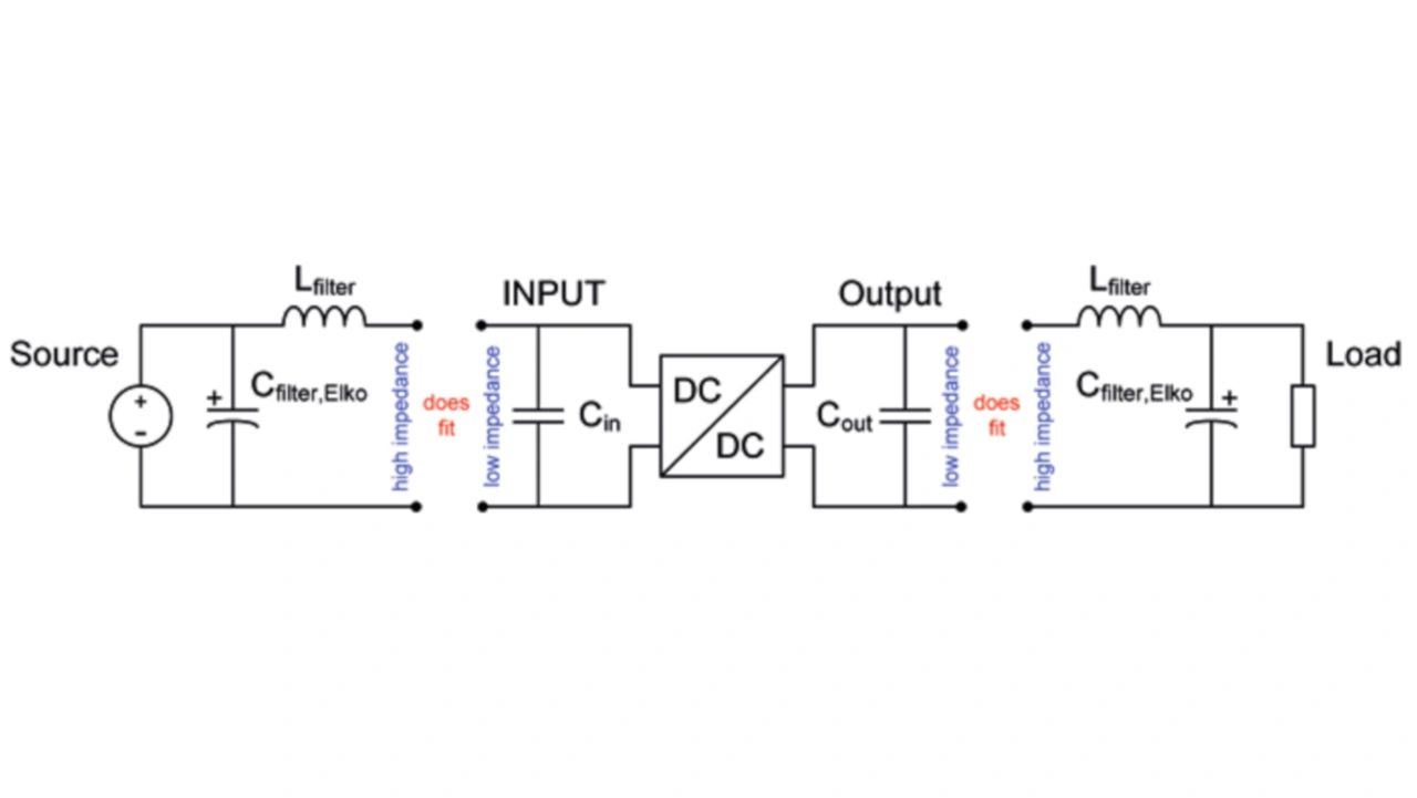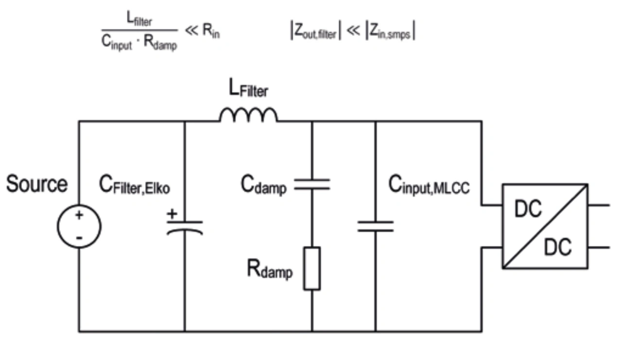 Eine geeignete Maßnahme, die Impedanz des Eingangsfilters im Frequenzbereich über 10 MHz zu erhöhen, besteht darin, den LC-Filter um einen SMT-Ferritzu ergänzen . Dabei ist die Abhängigkeit der Impedanz vom DC-Strom zu berücksichtigen. Als Filterkondensatoren empfehlen sich kleine SMT-Elektrolytkondensatoren mit Werten von 10 µF bis 100 µF. Ziel in der Auslegung sollte es sein, die Filterinduktivität möglichst klein zu halten und dafür die Filterkapazität zu vergrößern. Diese Maßnahme wirkt sich positiv auf den Wirkungsgrad aus, während die Gefahr einer Instabilität aufgrund der negativen Eingangsimpedanz sinkt.