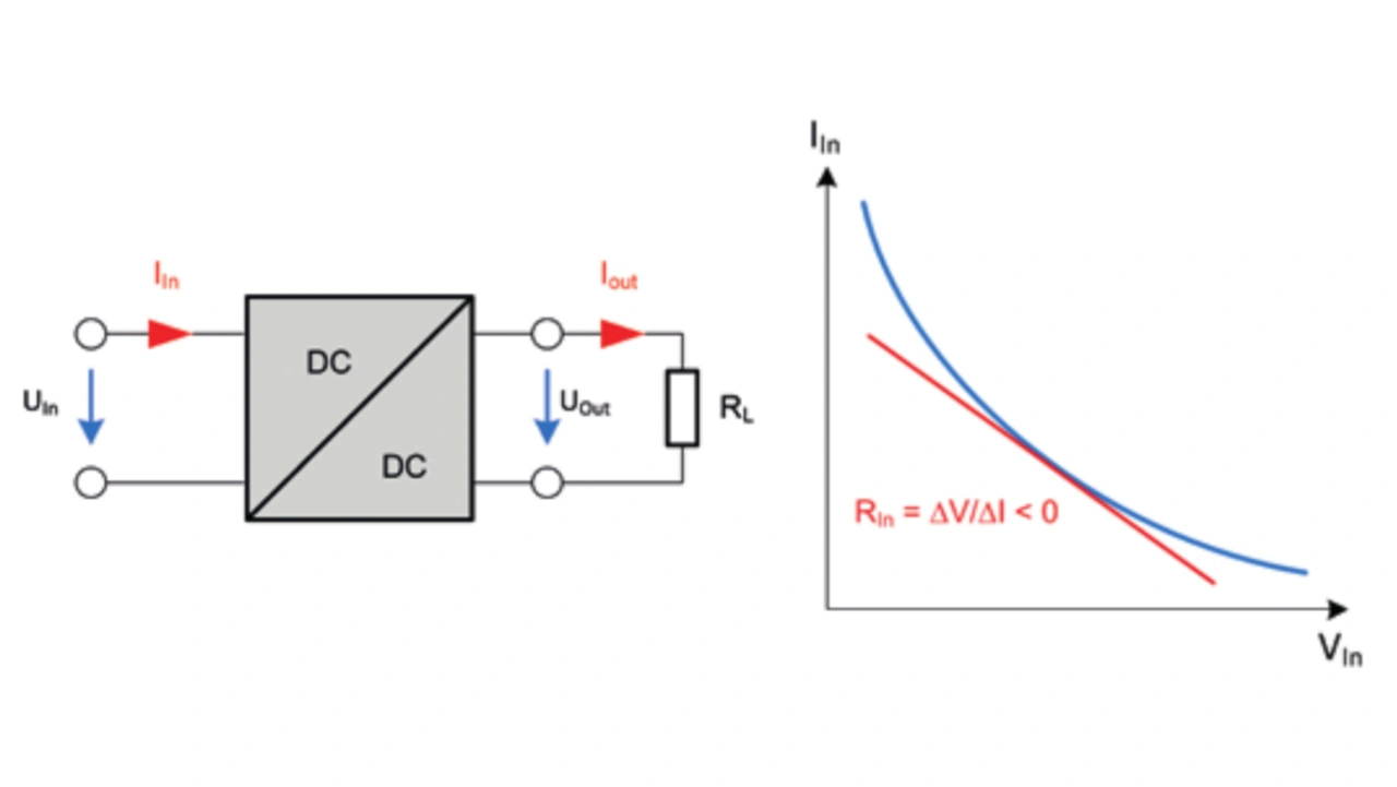 Beim Einsatz von MLCCs als Eingangskondensatoren in Kombination mit einer Filterinduktivität oder einer parasitären Zuleitungsinduktivität kann bei Spannungstransienten (z. B. abruptes Absinken der Eingangsspannung) der Eingang von Schaltreglern zu schwingen beginnen. Diese Oszillationen werden durch die sogenannte negative Eingangsimpedanz (Bild 3) in Kombination mit dem entstandenen LC-Schwingkreis verursacht. Dabei bilden die Filterinduktivität und der MLCC am Eingang einen Schwingkreis mit starker Resonanzüberhöhung. Hierbei wird der LC-Schwingkreis mit einer Restenergie gespeist, die der Wandler während der Transiente nicht aufnimmt.