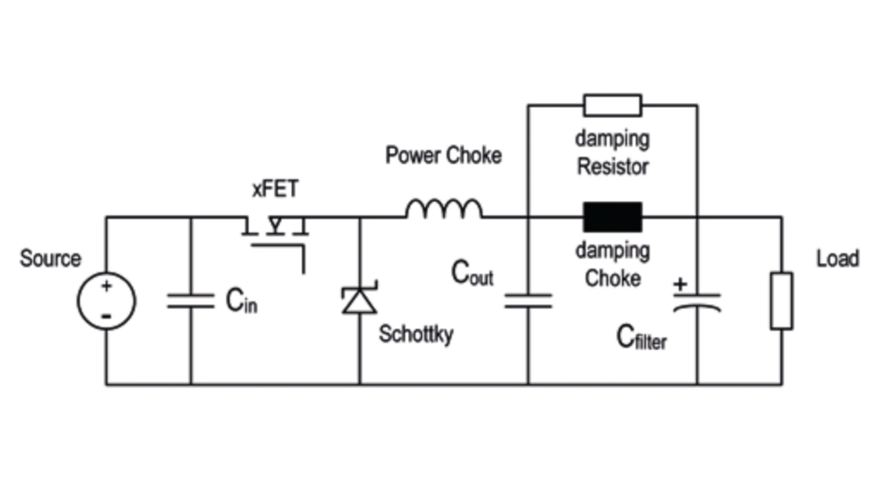 Bei modernen Schaltwandlern sind Schaltfrequenzen von 250 kHz bis 4 MHz üblich. Um die Störungen bei der Schaltfrequenz und deren Oberwellen in den Griff zu bekommen, eignen sich LC-Tiefpassfilter (Bild 2). In der Praxis sollte die Eckfrequenz des Filters auf ein Zehntel der Schaltfrequenz des Reglers gelegt werden, um deren Störamplitude um etwa 40 dB zu dämpfen.