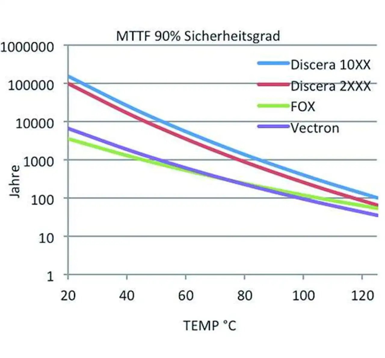 Die MTTF-Werte handelsüblicher Quarzoszillatoren liegen bei einer Betriebstemperatur von +85 ºC bei etwa 1,6 Millionen bis 1,75 Millionen Stunden. Demgegenüber weisen die MEMS-Oszillatoren von Discera MTTF-Raten (Mean Time To Failure) von mehr als 5,6 Millionen Betriebsstunden bei +85 ºC auf (Bild 1).