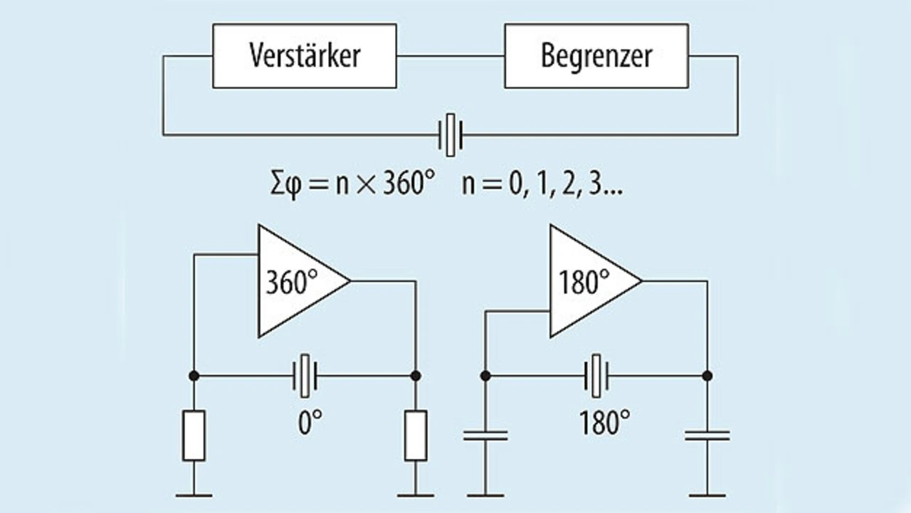 Ein Quarzoszillator ist im allgemeinen ein rückgekoppelter Verstärker, wobei im Rückkopplungsnetzwerk der Schwingquarz als frequenzbestimmendes Bauelement enthalten ist. Eine prinzipielle Oszillatorschaltung zeigt Bild 1. Selbsterregung tritt ein, wenn die Schleifenverstärkung größer als eins ist. Der Oszillator schwingt dann mit der Frequenz, bei der die Phasendrehung der gesamten Schleife den Wert 2n × π (n = 0, 1, 2, ...) hat.