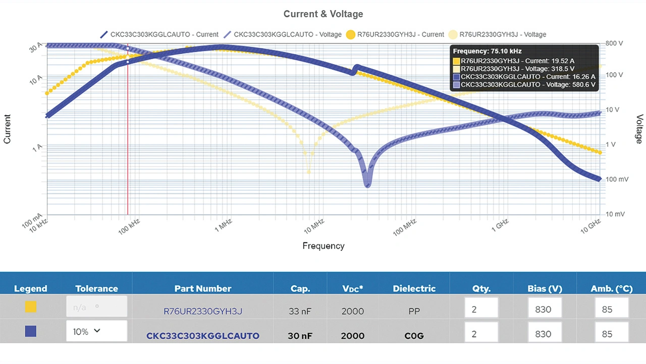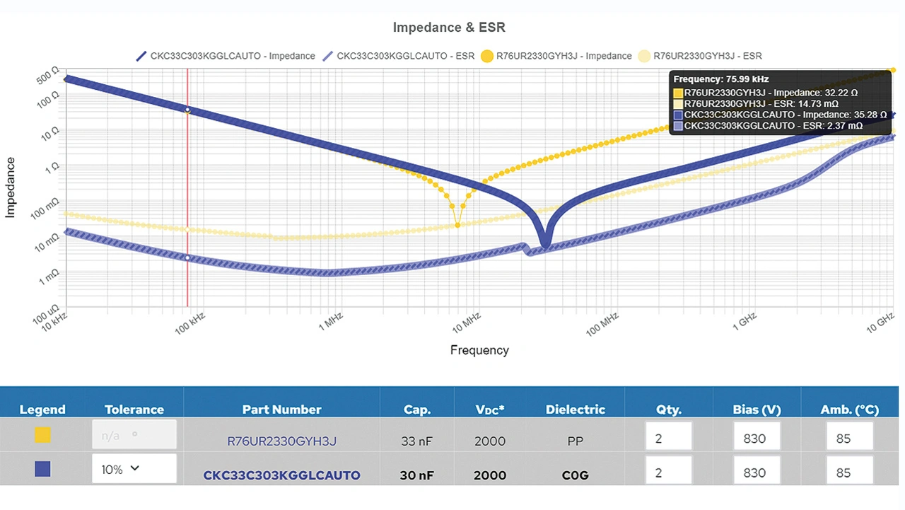 Mit dem Online-Tool K-SIM ist es möglich, beide Kondensatoren in einem Diagramm darzustellen und damit die individuellen Eigenschaften zu erkennen (Bild 2 und 3). Die blaue Kurve stellt den Keramikkondensator dar, die gelbe Kurve den Filmkondensator. Auch der Graph zeigt, dass der Filmkondensator einen höheren Rippelstrom bietet.