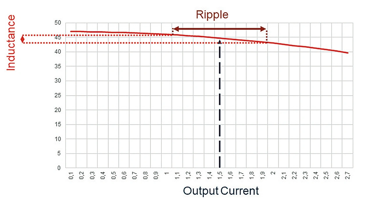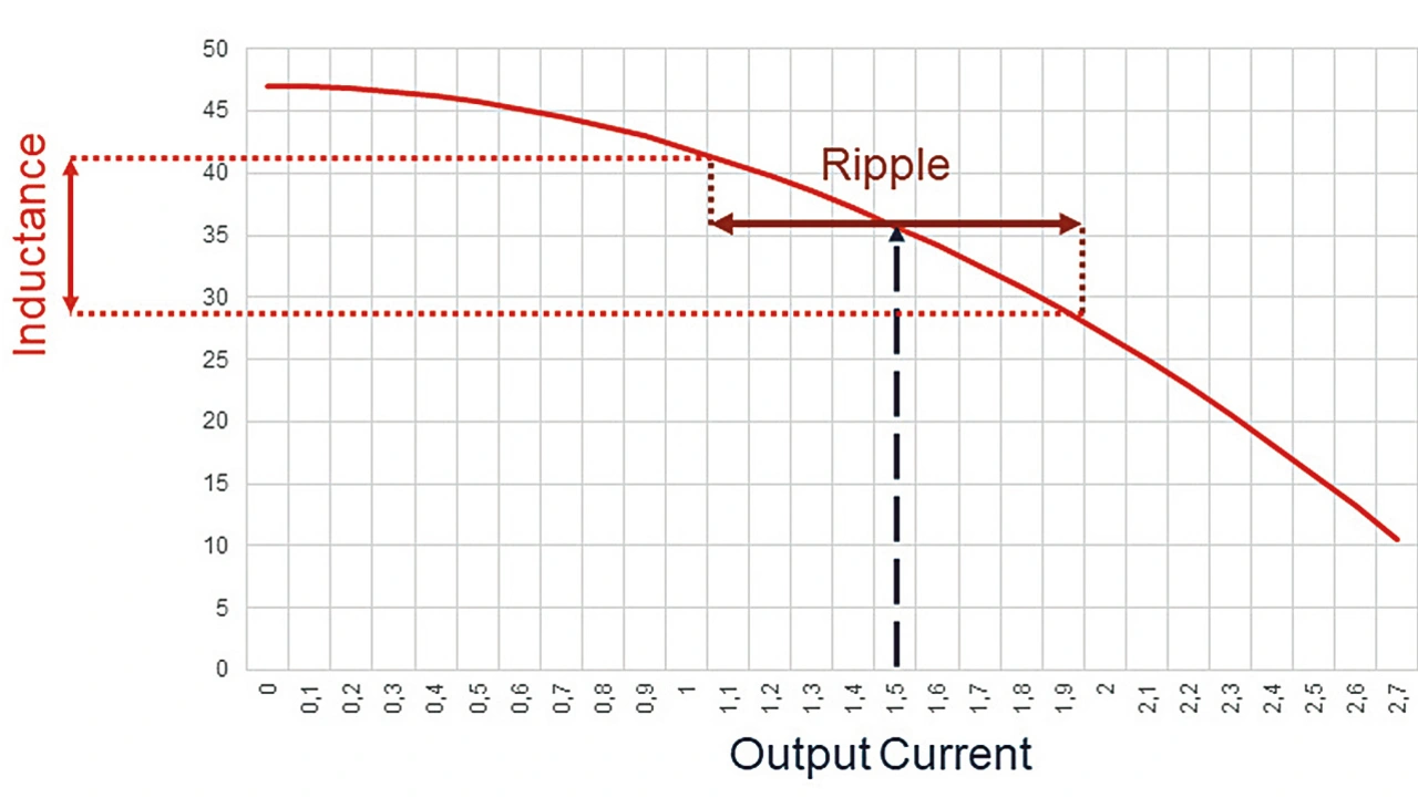 Wenn die Sättigung einer Induktivität steil ist (Bild 2), wird der Rippelstrom den effektiven Induktivitätswert verringern.