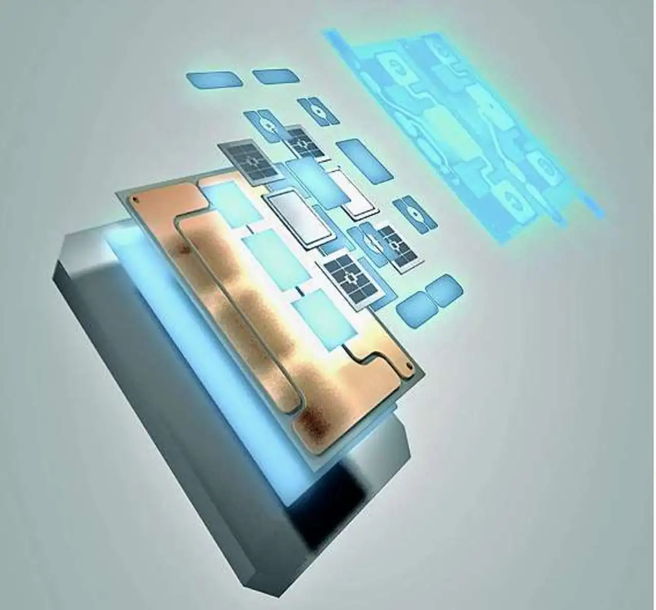 Die Wärmeleitpaste wird durch eine Silber-Sinterlage ersetzt, sodass der thermische Widerstand sinkt und die Leistungsdichte um über 30 Prozent steigen kann. Die flexible Platine mit der flächigen Chipkontaktierung anstelle von Bonddrähten verbessert die Zuverlässigkeit um den Faktor 10 im Vergleich zu klassischen Aluminium-Bonddrähten (Bild 2).