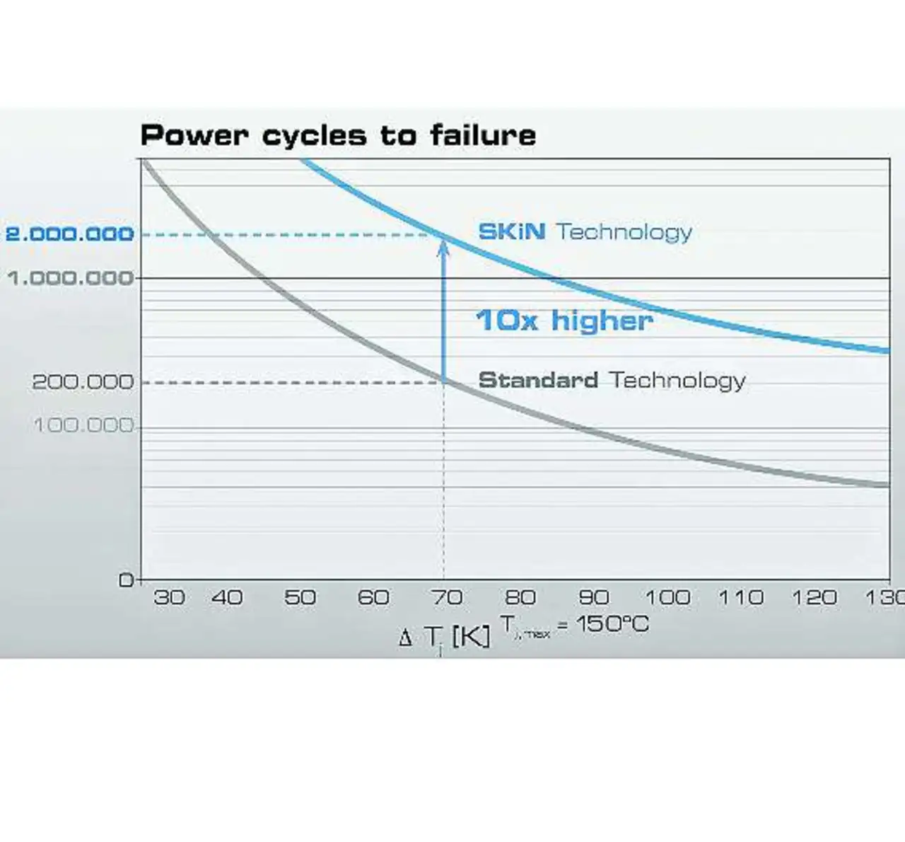 Erhöht sich die Temperatur um 25 K, verringert sich die Zuverlässigkeit um den Faktor 5. Neue Halbleitermaterialien wie SiC und GaN erlauben noch höhere Sperrschichttemperaturen als die klassischen Silizium-Bauelemente. Neue IGBT- und MOSFET-Chiptechnologien haben höhere Stromdichten im Vergleich zu früheren Generationen. Das konventionelle Aluminimum-Dickdrahtbonden stellt bei kleinen Oberseitenkontakten ein Hindernis für höhere Lastströme und verbesserte Zuverlässigkeit dar. Es ist zwar möglich, das Drahtbonden weiter zu optimieren und neue Materialien einzusetzen, dies bedeutet aber Aufwand bei der Chipherstellung und damit höhere Kosten der Halbleiter.