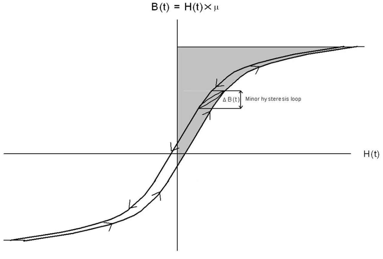 Multipliziert man die Fläche der Magnetisierungsschleife mit dem Volumen des Kerns, ergibt sich die Verlustenergie ET im Kern. Die Verlustleistung ist dann ET multipliziert mit der Schaltfrequenz des Wandlers. Solche Hystereseverluste (auch Ummagnetisierungsverluste genannt) variieren als eine Funktion von ΔBn, wobei n für die meisten Ferrite zwischen 2,5 und 3 liegt. Diese Betrachtung trifft nur zu, wenn das Kernmaterial nicht in die Sättigung getrieben wird und wenn die Schaltfrequenz im erlaubten Bereich liegt. Typischerweise arbeiten Abwärts- und Aufwärtswandler mit positiven Spulenströmen, also im ersten Quadranten der B/H-Kennlinie. Eine zusätzliche Kategorie von Kernverlusten ist den so genannten Wirbelströmen zuzuschreiben, welche im Kernmaterial fließen. Induziert werden sie durch den sich in der Zeit verändernden Fluss dΦ/dt. Nach dem Gesetz von Lenz erzeugt eine Flussänderung einen elektrischen Strom, der wiederum einen Fluss induziert, der sich gegen die erzeugende Flussänderung richtet. Diese Wirbelströme fließen durch das Kernmaterial und erzeugen einen Verlust der magnetischen Energie. Eigentlich ist es der elektrische Widerstand des Kernmaterials, der diesen Energieverlust verursacht (I2 · R).