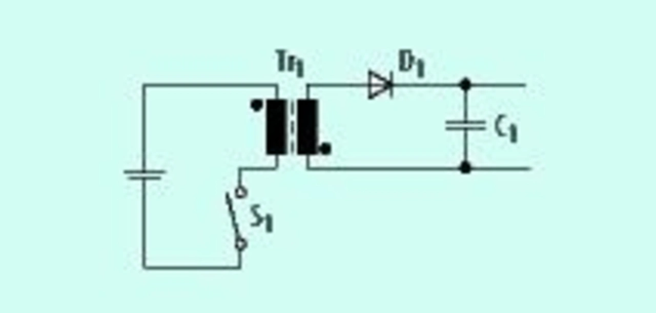1. Schalter geschlossen: Bei geschlossenem Schalter liegt am Übertrager die Eingangsspannung an. Aufgrund der Induktivität des Übertragers ergibt sich ein linearer Stromanstieg auf der Primärseite. Aufgrund der Polarität des Übertragers und der Stellung der Diode fließt auf der Sekundärseite kein Strom. Die eingespeiste Energie wird im Luftspalt des Übertragers gespeichert.