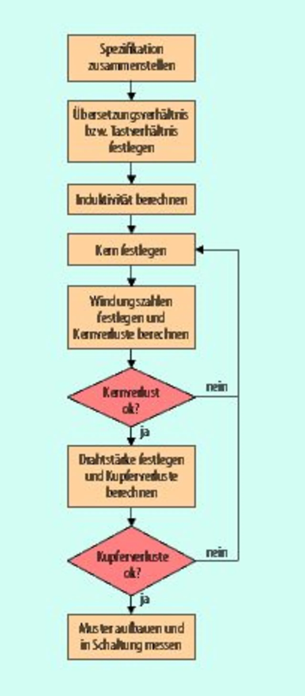 Nachfolgend wird anhand eines Beispiels das Design eines Sperrwandler-Übertragers durchgeführt. Bild 1 zeigt einen Überblick über die Vorgehensweise. Wie aus dem Flowchart ersichtlich, ist der Prozess iterativ.