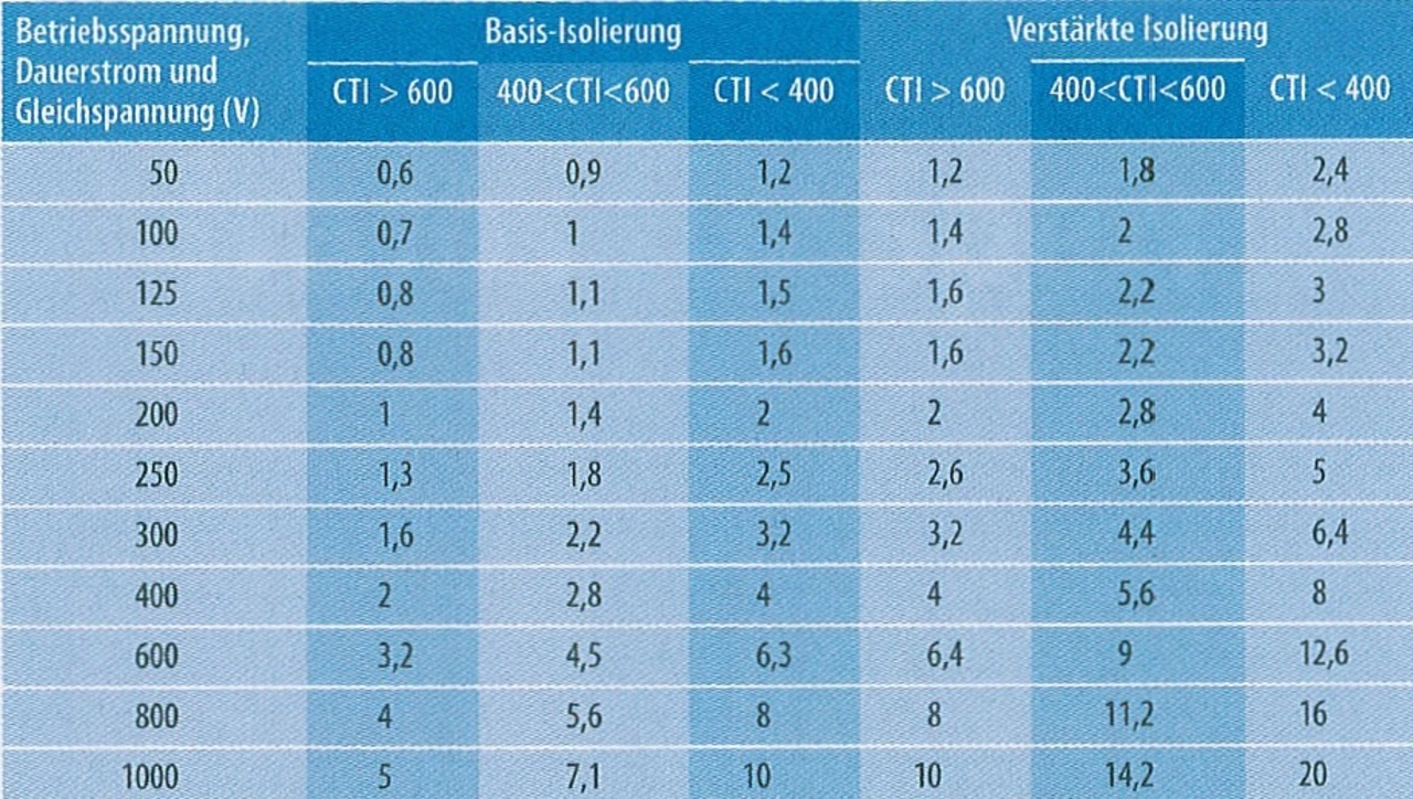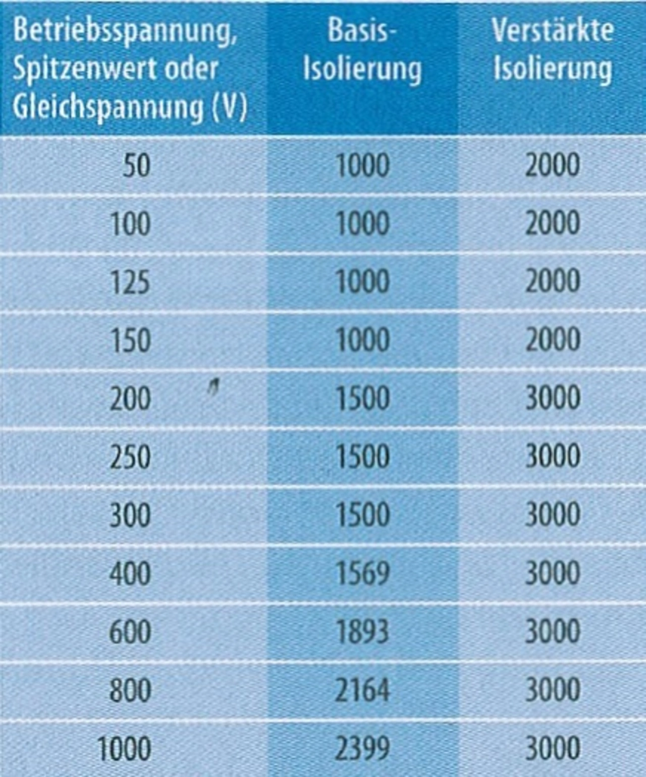 Einen Anhaltspunkt über die geforderten Luft- und Kriechstrecken und Hochspannungsprüfungen zeigen die Tabellen 2 und 3. Die Werte wurden