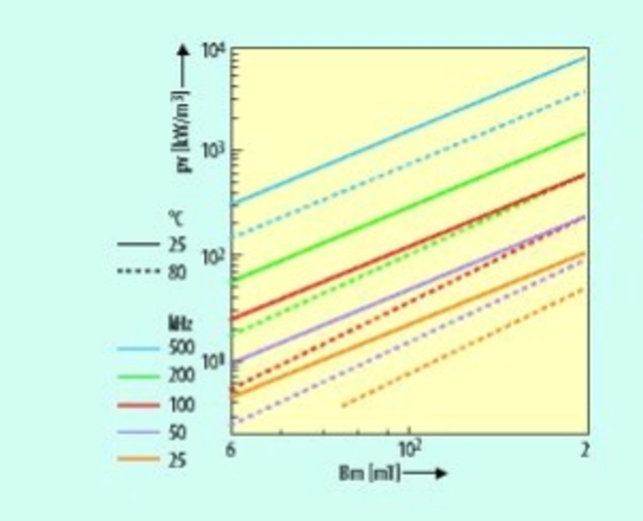 Als Kernmaterial werden bei Frequenzen zwischen 100 und 500 kHz in der Regel MnZn-Ferrite mit einer Permeabilität von 2000 bis 2500 verwendet, z.B. 1P2400. Die Sättigungs-Flussdichte Bsat von 1P2400 liegt bei 360 mT bei +100 °C. Bild 4 zeigt die spezifischen Verluste für gegebene Frequenzen und Flussdichten.