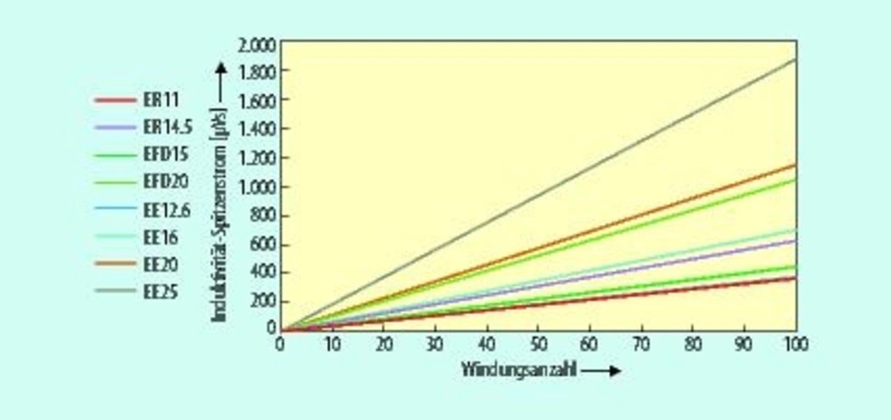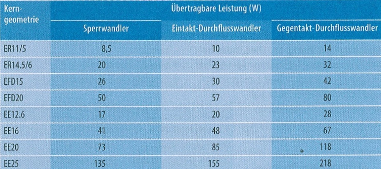 Die Bauform wiederum hängt von der zu übertragenden Leistung ab. Einen ersten Anhaltspunkt liefert Tabelle 4. Für das vorgegebene Beispiel fällt die Wahl auf einen EFD15-Kern.