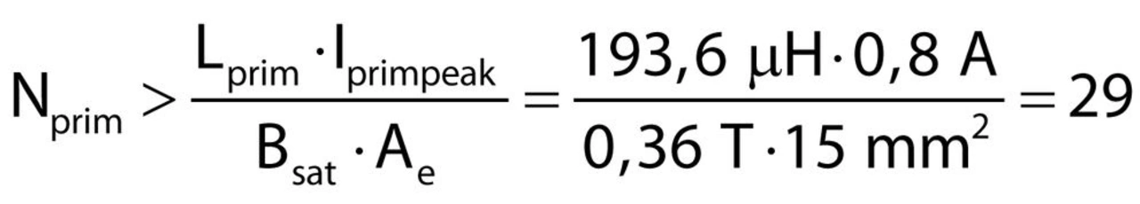 Die minimale Windungszahl wird durch die maximale magnetische Flussdichte im Kern festgelegt. Das Ferritmaterial 1P2400 hat eine Sättigungs-Flussdichte von etwa 360 mT. Für die minimale Windungszahl ergibt sich somit ein Wert gemäß Formel 11: