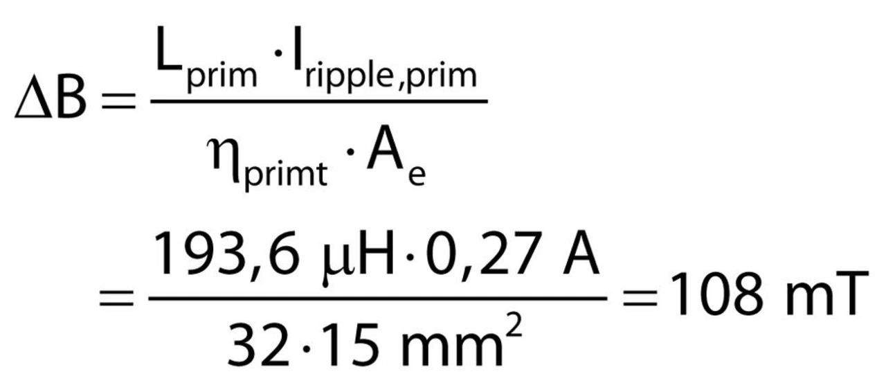 Als Nächstes müssen die mit der gewählten Primärwindungszahl zu erwartenden Kernverluste berechnet werden. Dazu ist die Änderung der Flussdichte ΔB gemäß Formel 12 zu ermitteln; hierbei gelten: ΔB: Änderung der Flussdichte; Iripple,prim: primärer Rippelstrom